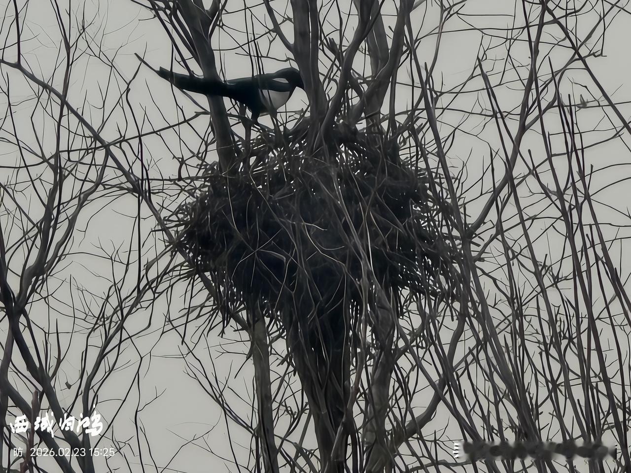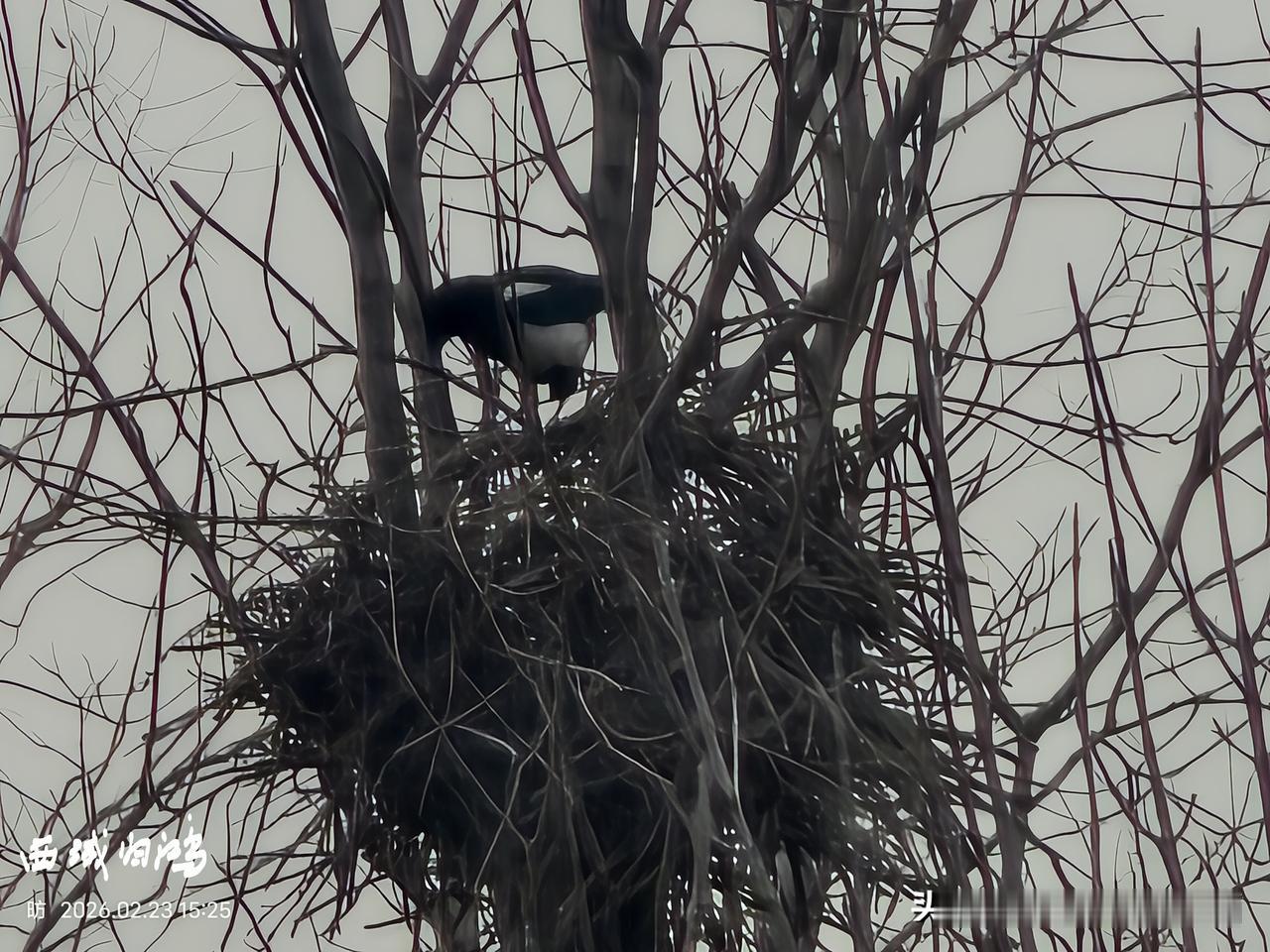 分享一张最近随手拍的照片在家中透过窗看见远处树上一只喜鹊在筑巢,拉近放大拍摄,只