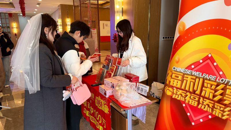 活动现场工作人员为每对新人送上“爱的福彩礼包”,内含“丙午马”生肖即开票、“喜相逢”刮刮乐及定制文创宣传品,寓意“马到福来、喜结连理”。新人们现场体验刮奖乐趣,欢声笑语中不少人收获意外惊喜,为领证之日添彩。
