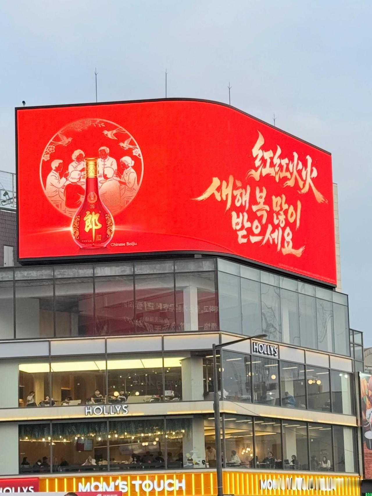 中国游客在首尔梨泰院惊讶发现郎酒大屏广告和大广告牌,韩国人很少用大红色,所以显得
