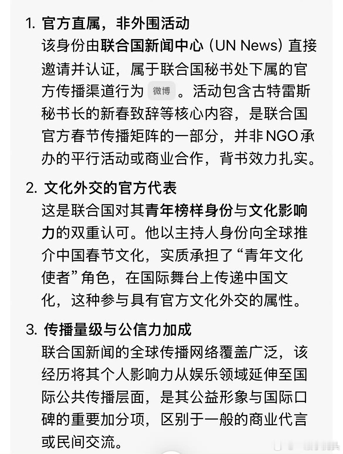 张艺兴联合国新闻客座主持人 这么高的level没人夸吗?查看了一下,张艺兴是目前【唯一一位以「联合国新闻客座主持人」身份亮相的中国艺人】,这是联合国新闻中心官方授予的、面向全球春节传播的专属荣誉。这不仅是张艺兴的国际影响力和知名度,更是国人的骄傲啊,莲姐姐太谦虚了张艺兴