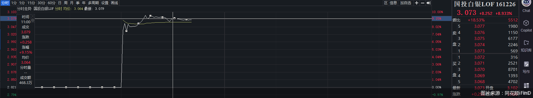 交易行情数据显示,复牌后,国投瑞银白银基金A份额大涨,盘中最高一度涨超9%。截至上午11时,该基金涨幅为9.15%。
