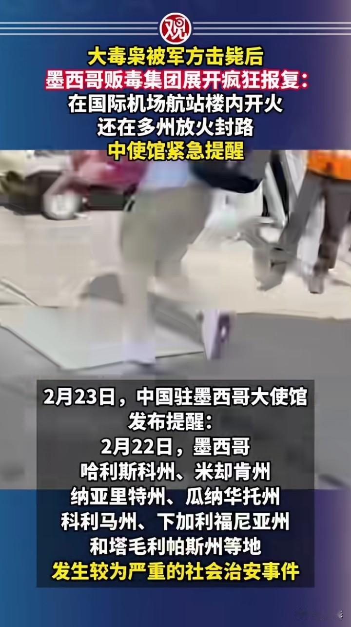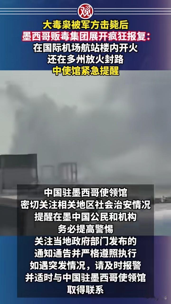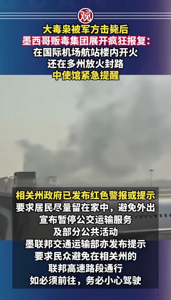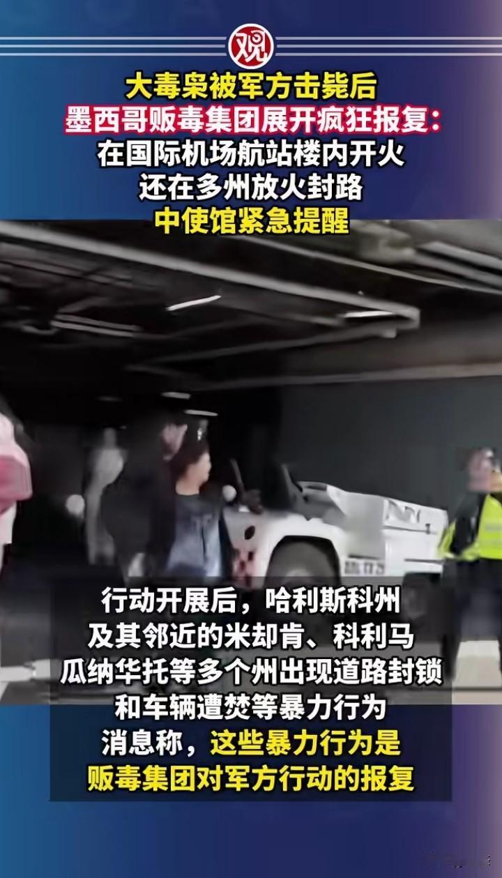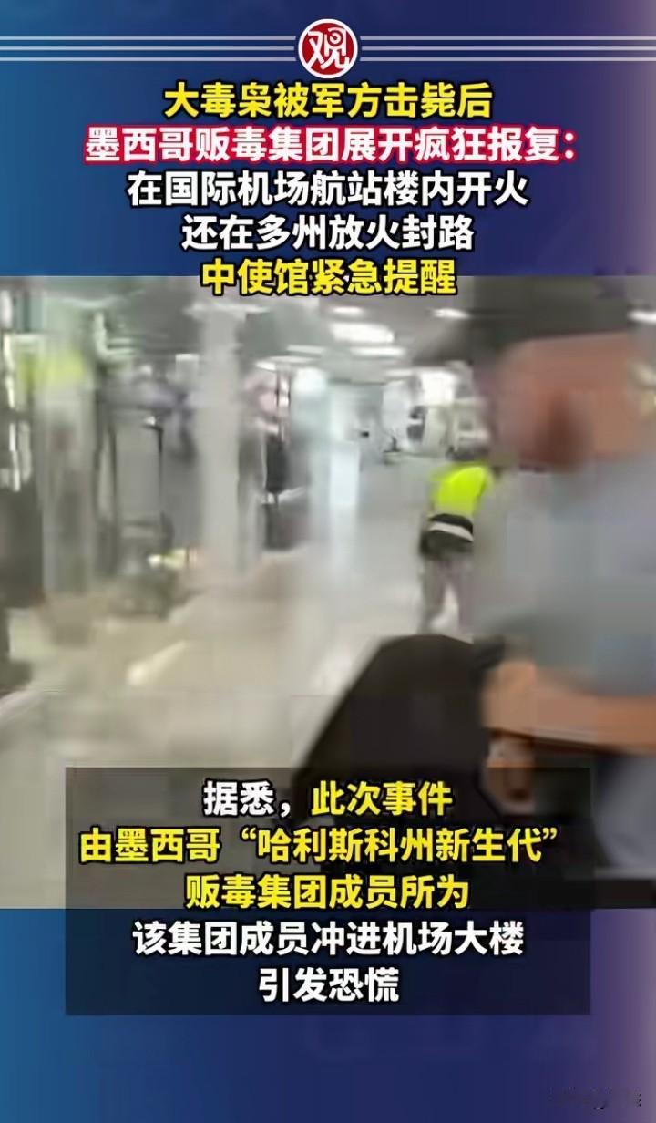 不敢相信,墨西哥大毒枭被军方击毙后,没想到墨西哥毒贩集团在各地进行疯狂的报复,在国际机场航站楼内开火,引发恐慌,还在各州封锁道路个焚烧车辆。 中国大使馆已经发布紧急提醒,一定要注意安全,和相关消息。 没想到一个毒贩集团都这么猖狂,哪里来的勇气,希望把这些毒贩集团一网打尽,不然老百姓很难有一个安全的环境。 中国在禁毒和打击毒贩方面是非常成功,如果不严厉打击,后果不堪设想。 你们怎么看墨西哥的毒贩那么猖狂?