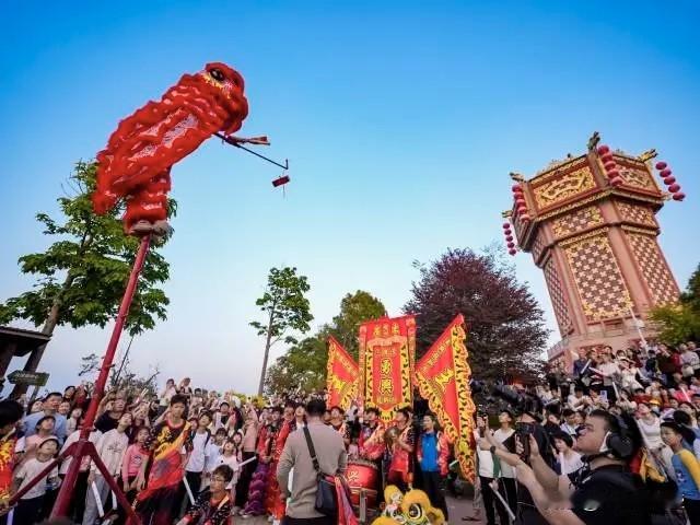 集卡领红包煦和湾世界最大花灯楼举行亮灯仪式,吸引游客众多,现场舞龙舞狮、载歌载舞