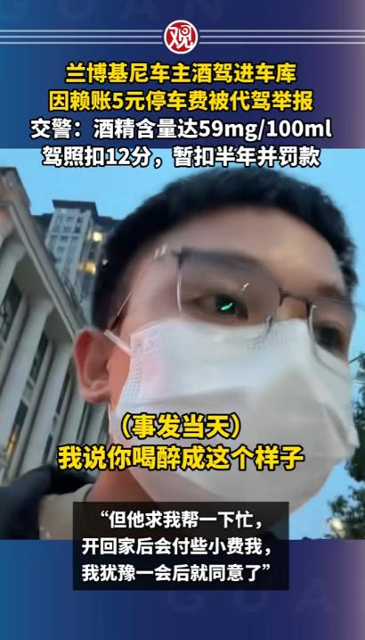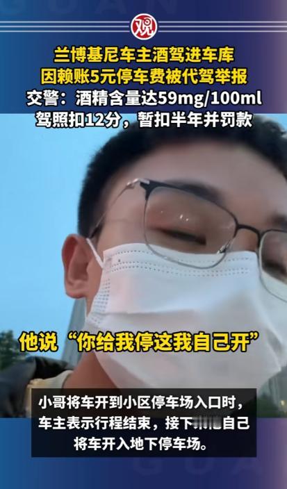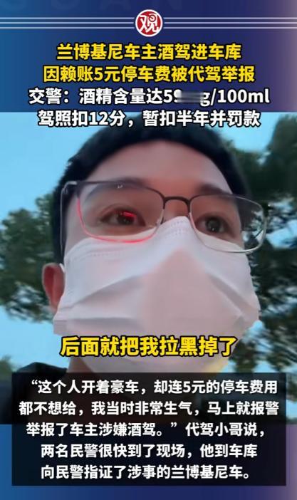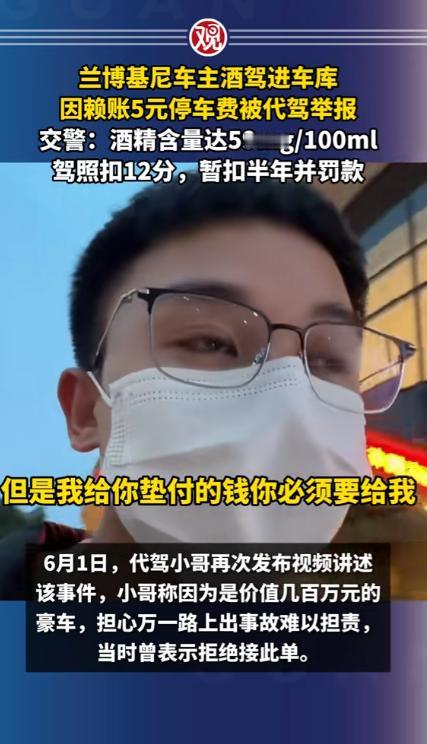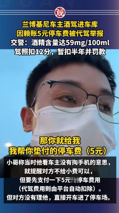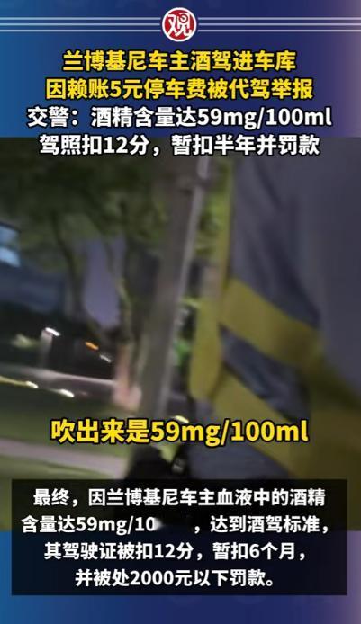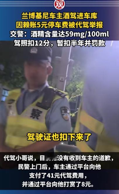 浙江宁波,一男子是代驾,半夜11点半接到订单,对方喝多,车是兰博基尼,值几百万,男子看车贵重,怕有事赔不起,要他另请高明,车主态度诚恳,求男子将车开回小区,会另给小费,男子勉强答应,车出酒店,要交5元停车费,车主要男子代交,到小区和代驾费一起支付,谁知到了小区,车主要男子下车,非要自己开进车库,既不给小费,也不给停车费,还把男子拉黑,男子被耍,一气之下报警,举报车主酒驾,车主悲剧了。 2025年,代驾小哥骑着折叠电动车穿梭在街头,白天他有固定工作,晚上跑代驾只是为了多赚点钱补贴家用,寒来暑往,他早已习惯了在深夜里等待订单的日子。 手机突然响起代驾平台的提示音,屏幕上跳出的订单信息让他瞬间提起了精神,车辆一栏标注的名字让他心里一紧,兰博基尼。 这样的车市场价动辄三四百万,对于常年和普通家用车打交道的代驾师傅来说,无疑是个让人忐忑的存在。 代驾小哥把电动车停在酒店门口的路边,远远就看到了那辆停在醒目位置的兰博基尼,流畅的车身线条在灯光下格外亮眼,车漆光洁如新,路过的行人都会忍不住多看几眼。 车主是一位三十岁左右的男子,刚从酒店里走出来,浑身散发着浓重的酒气,走路脚步虚浮,明显喝了不少酒。 看到代驾小哥过来,车主连忙上前搭话,示意他帮忙把车开回小区。 代驾小哥当场就打起了退堂鼓,他直言这车太过贵重,自己只是普通代驾,万一行驶过程中出现刮蹭或者小意外,维修费用远远超出他的承受范围,根本赔不起,他劝车主重新找一位更有经验的代驾,或是联系没喝酒的朋友前来接送。 车主听了代驾小哥的顾虑,态度变得格外诚恳,拉着代驾小哥不停求情,说自己家就在附近的小区,全程只有几公里的路程,几分钟就能抵达,绝对不会出现任何问题。 为了让代驾小哥放心接单,车主还主动承诺,除了平台规定的代驾费用,会额外支付一笔小费,就当是为豪车代驾的辛苦补偿。 代驾小哥看着车主醉醺醺却一脸恳切的样子,再想到出门打工都是为了生计,拒绝了这单生意也实在可惜,纠结了好一会儿,最终还是点头答应了下来。 坐进兰博基尼的驾驶座,代驾小哥整个人都绷了起来,车内的内饰精致考究,操控逻辑和普通家用车截然不同,他双手紧紧握住方向盘,调整座椅和后视镜时都格外小心,生怕不小心碰到哪里造成损伤。 车子刚驶出酒店停车场,出口的收费员就示意缴费,停车费一共 5 元。 车主坐在副驾驶座上,摸了摸口袋又翻看了手机,跟代驾小哥说自己身上没有现金,手机操作也不方便,让代驾小哥先帮忙垫付这 5 元钱,等车子开到小区,再把代驾费、小费和停车费一起结算清楚。 代驾小哥想着 5 元钱并不算多,车主既然承诺了一并支付,也就没有过多计较,掏出手机扫码支付了停车费。 十几分钟后,车子顺利抵达车主所说的小区门口,代驾小哥刚准备按照导航路线把车开进地下车库,车主却突然伸手拦住了他,语气生硬地让他立刻下车,剩下的路程要自己开车进入车库。 这突如其来的变故让代驾小哥愣在原地,此时的车主像是完全变了一个人,之前的诚恳消失得无影无踪,满脸不耐烦,直接推开车门让他下车。 代驾小哥站在车外跟车主沟通,表示小费可以放弃,但是自己垫付的 5 元停车费必须归还,这是他的血汗钱,不是凭空而来的。 车主不仅没有理会代驾小哥的诉求,反而直接上车关闭车门,一脚油门将车开进了小区地下车库,全程没有摇下车窗多说一句话。 代驾小哥赶紧拿出手机,想通过平台联系车主索要费用,却发现自己已经被对方拉黑,拨打语音电话也显示无法接通。 那一刻,委屈和愤怒涌上心头,他半夜出门辛苦工作,冒着风险驾驶豪车,还自掏腰包垫付停车费,最后不仅没拿到一分钱报酬,还被人刻意耍弄,他心里清楚,自己干代驾是为了挣钱养家,从来不是来做慈善的。 冷静下来后,代驾小哥突然想起车主全程满身酒气,最后还坚持自己开车进入车库,这已经属于酒后驾驶机动车的行为。 他没有丝毫犹豫,立刻拿出手机拨打报警电话,把事情的前因后果如实告知警方,同时举报车主存在酒驾的违法行为。 最终民警给车主一次性记12分,并处一千元以上二千元以下罚款,代驾小哥配合警方完成笔录后,顺利拿回了自己垫付的 5 元停车费以及41块钱代驾费。 车主开着价值数百万的豪车,却在 5 元停车费和几十元代驾费上斤斤计较,丢失了最基本的诚信,也为自己的侥幸付出了代价。 酒驾本身就是危害道路安全的违法行为,无论驾驶距离长短,无论是否在公共道路主干道,只要在道路范围内驾驶机动车,酒精含量达标就会被认定为酒驾,都会受到法律的惩处。 对于这件事,您有什么想说的吗?欢迎评论区留言讨论。 信源:观察者网2025-06-02——《兰博基尼车主酒驾进车库,因赖账5元停车费被代驾举报,交警:酒精含量达59mg/100ml,驾照扣12分,暂扣半年并罚款》
