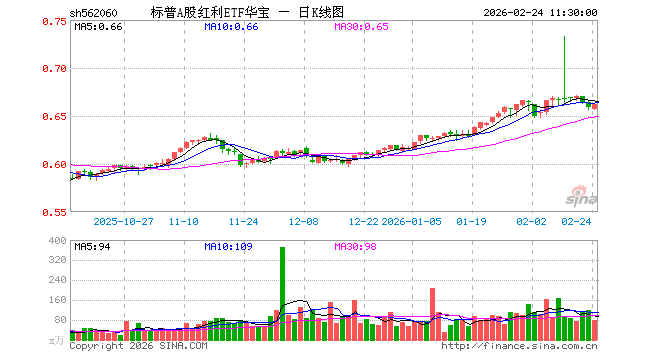 2月24日,截止午间收盘,标普A股红利ETF华宝(562060)涨0.46%,报0.662元,成交额5323.84万元。标普A股红利ETF华宝(562060)重仓股方面,孚日股份截止午盘涨0.77%,奥特维跌0.01%,中创智领涨1.50%,云天化涨8.27%,天山铝业涨1.05%,德业股份涨0.23%,宇通客车涨0.03%,建霖家居跌0.23%,川恒股份涨6.51%,景津装备涨2.71%。