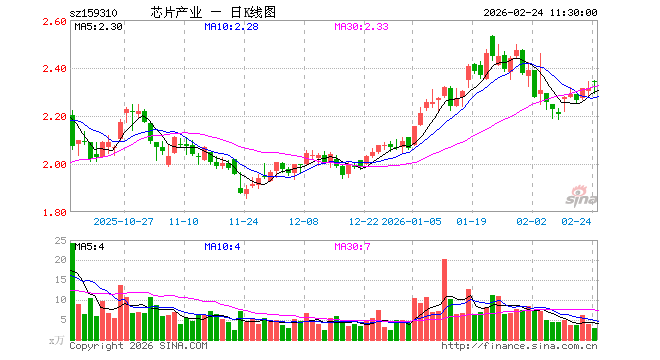 2月24日,截止午间收盘,芯片ETF天弘(159310)涨1.08%,报2.341元,成交额672.12万元。芯片ETF天弘(159310)重仓股方面,寒武纪截止午盘跌3.27%,中芯国际跌0.30%,海光信息跌3.23%,北方华创涨0.78%,兆易创新涨6.25%,澜起科技涨6.73%,中微公司涨0.38%,豪威集团涨1.30%,紫光国微涨1.70%,拓荆科技跌0.10%。
