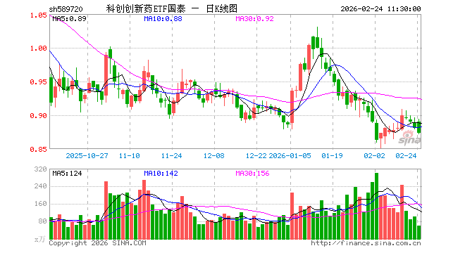2月24日,截止午间收盘,科创创新药ETF国泰(589720)跌0.91%,报0.873元,成交额5235.45万元。科创创新药ETF国泰(589720)重仓股方面,百济神州截止午盘涨0.75%,艾力斯跌0.21%,百利天恒涨1.33%,君实生物涨0.32%,泽璟制药跌9.45%,博瑞医药跌0.11%,荣昌生物跌3.60%,特宝生物跌0.39%,益方生物跌1.23%,皓元医药涨1.74%。