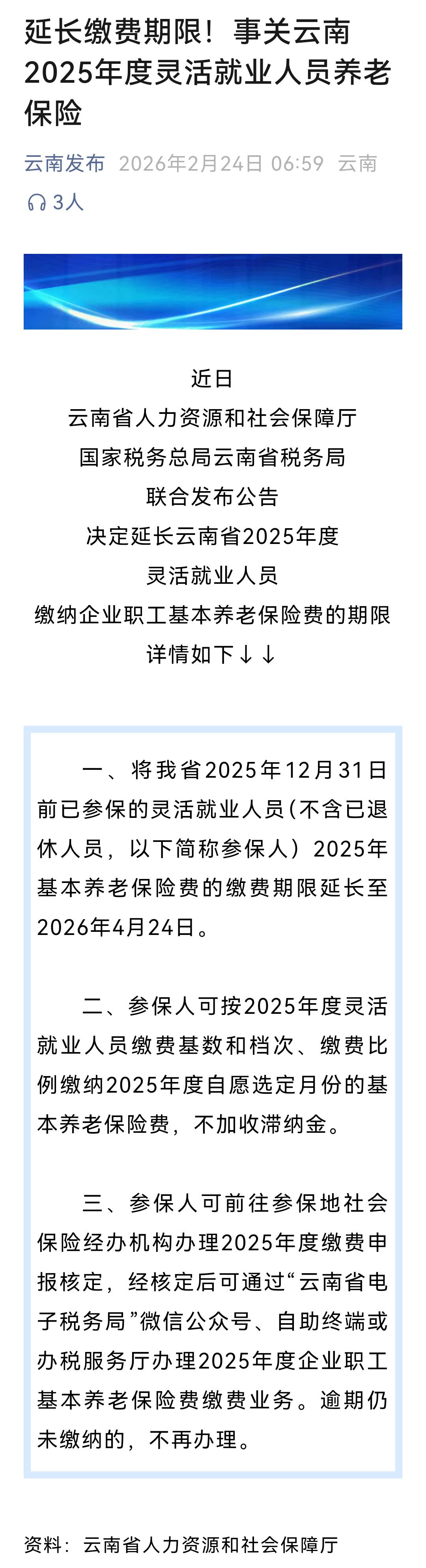 云南2025年度灵活就业人员养老保险缴费期限延长啦! 云南省人社厅和税务局联合公告,把2025年12月31日前参保的灵活就业人员(不含已退休人员)2025年保费缴费期延到2026年4月24日。参保人能按2025年度标准缴纳自选月份保费,还不加收滞纳金。办理时,先去参保地社保经办机构申报核定,之后可通过“云南省电子税务局”微信公众号等渠道缴费。 这对收入不稳定的灵活就业者来说太友好了,不用担心逾期,能更从容安排资金。 灵活社保 缴纳灵活就业 灵活养老补缴 灵活缴费流程 云南 灵活就业