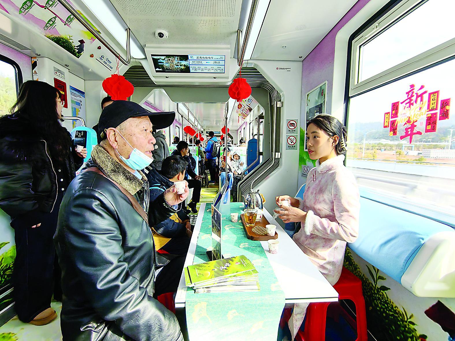 春节期间,福建南平武夷有轨电车有限公司推出新春文化专列,车厢内精心装点了红灯笼、福字窗花与马年吉祥文创元素,吸引了不少市民游客上车体验。此外,在南平市站、黄土站、东山埔站、武夷山站等重点站点,福建南平武夷有轨电车有限公司还设置了互动体验、打卡盖章、文创兑换等特色活动。图为19日,市民游客在“天心传景号”茶文化专列体验茶文化。(张行健陈颖摄)