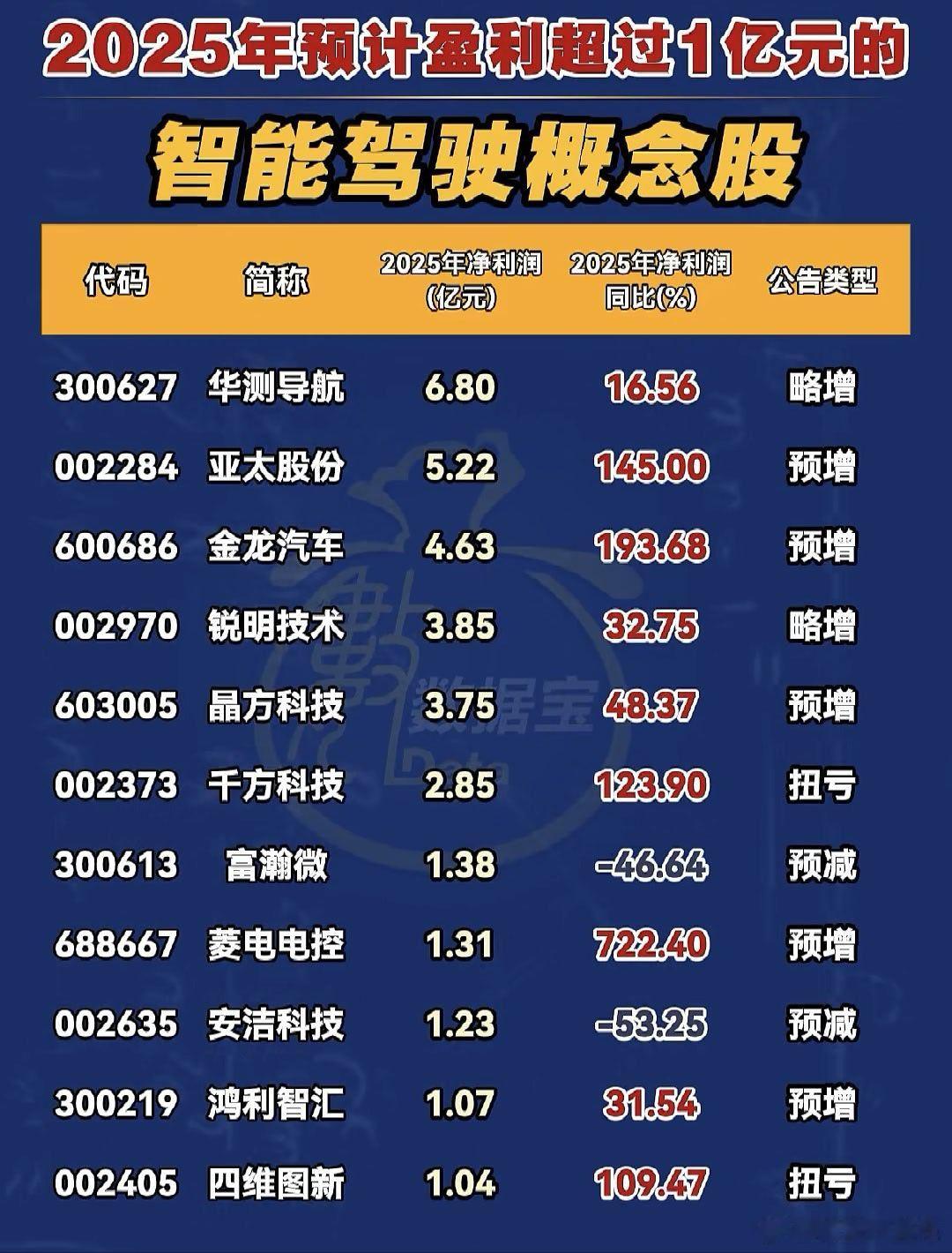 2025年预计盈利超过1亿元的智能驾驶概念股名单A股