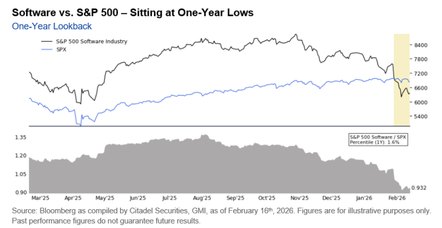 Ai带来对软件行业的颠覆叙事,Scott Rubner认为目前处于:先卖、再研究,并加剧了美股向周期/防御的轮动。