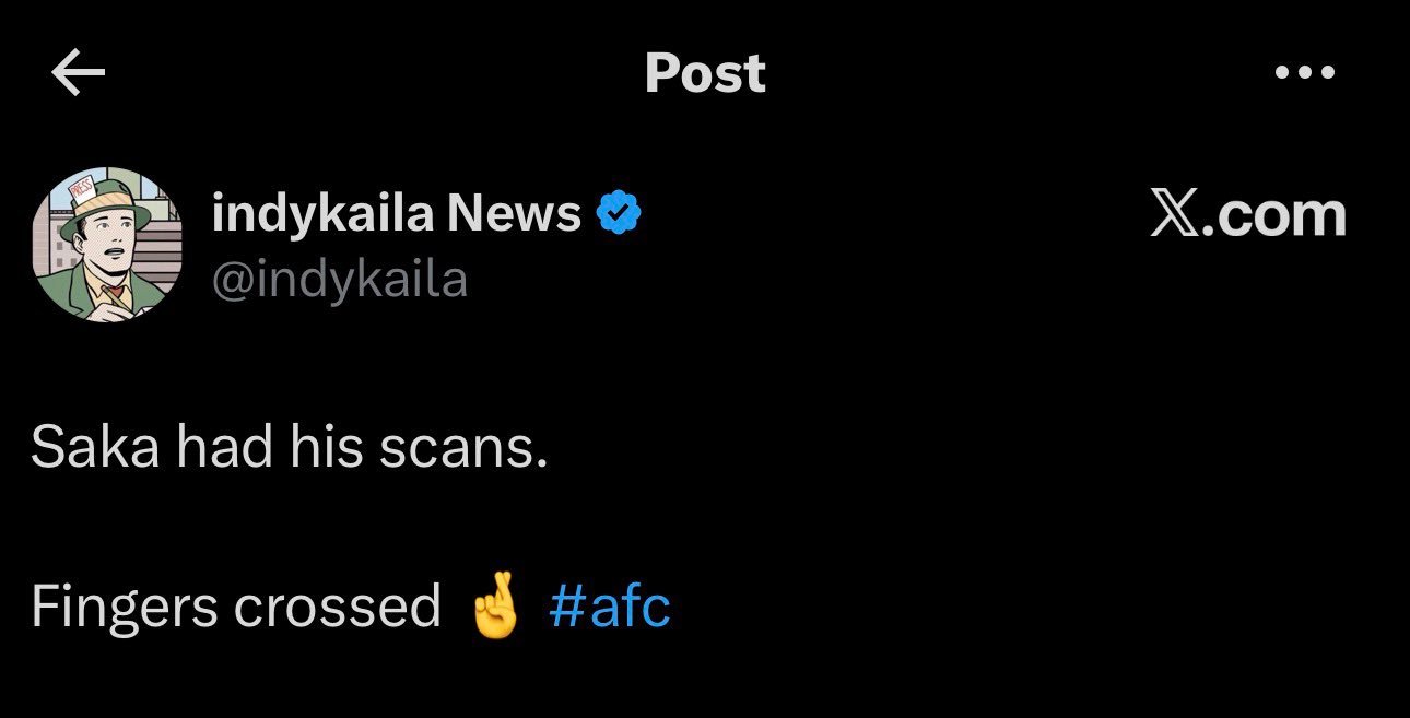 HandofArsenal消息,萨卡今天并未接受任何扫描。