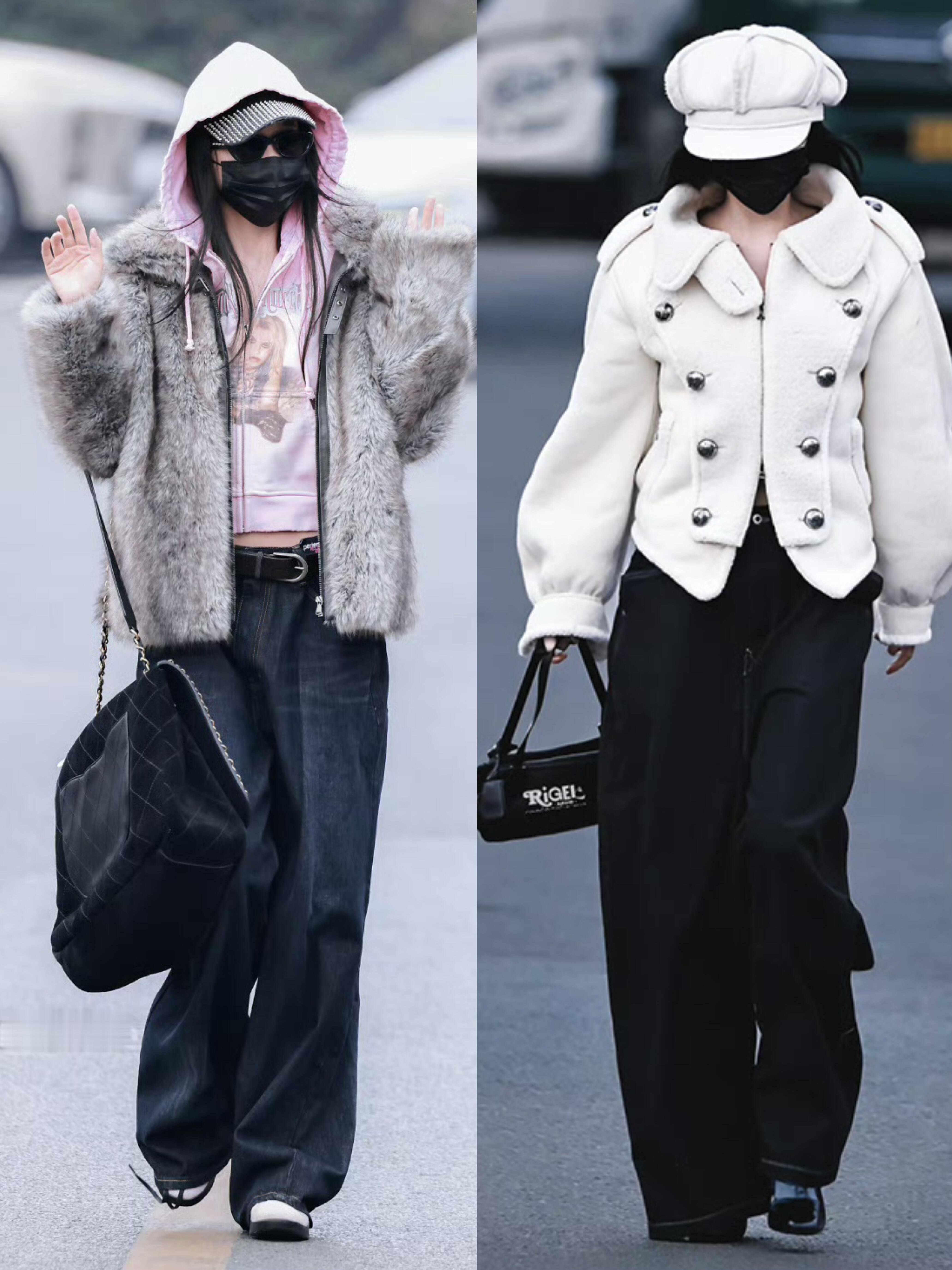 米白毛绒外套搭配浅蓝牛仔裤,再叠穿黑色长袜与亮面短靴,粉色背包点亮整体,冬日街头
