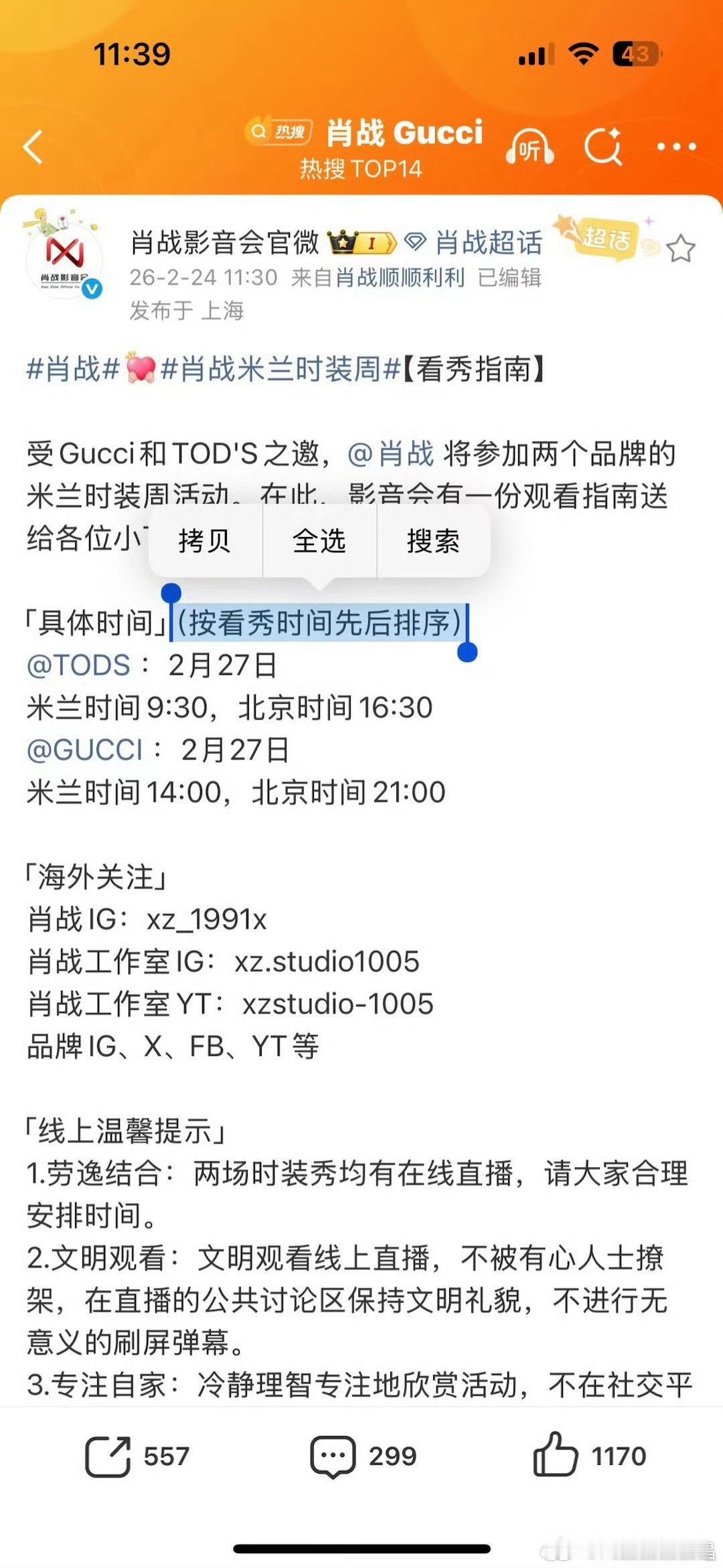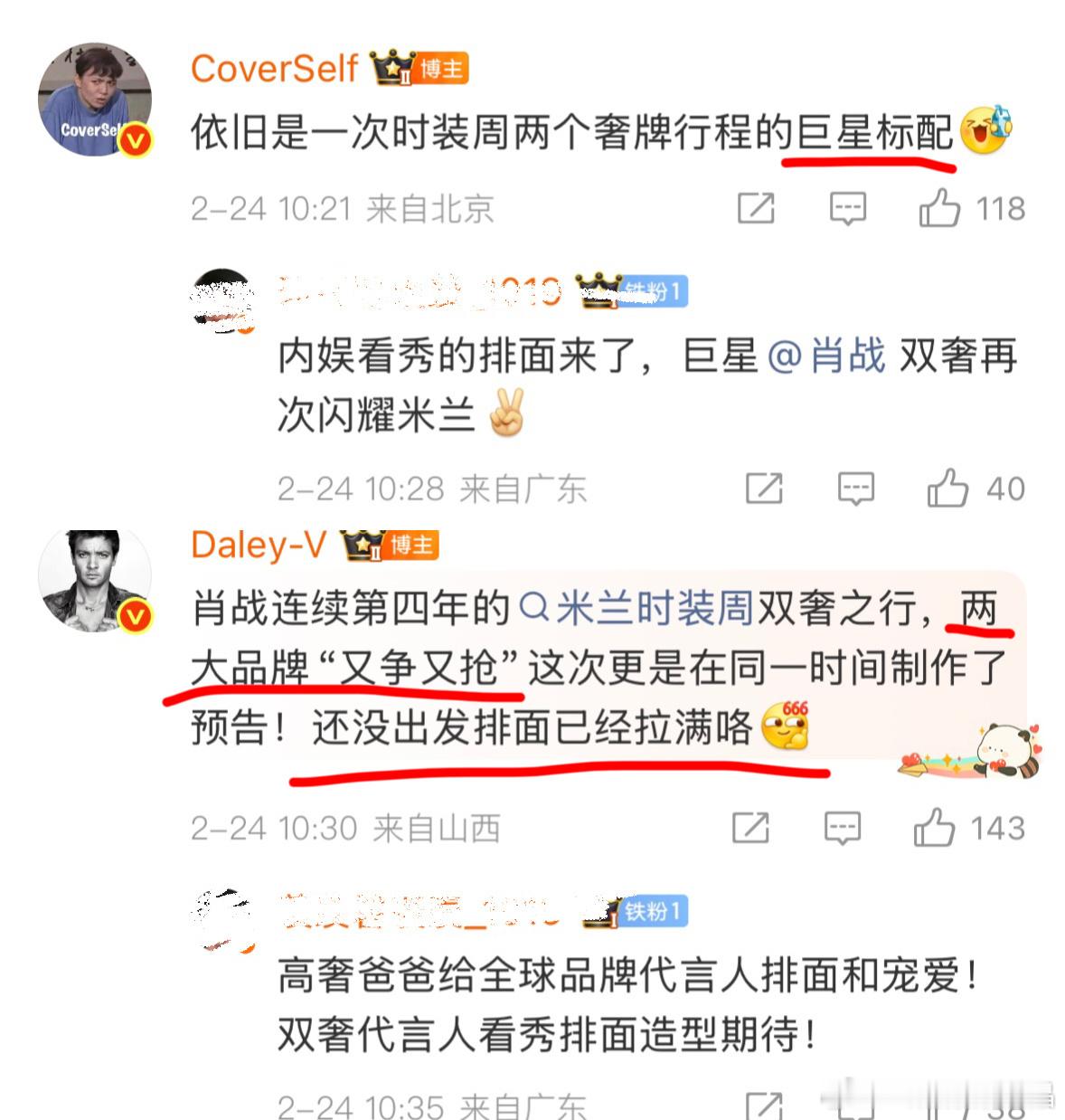 肖战来端水了因为肖战一天要看两个品牌的秀,影音会发了一份看秀指南给粉丝,还写着按