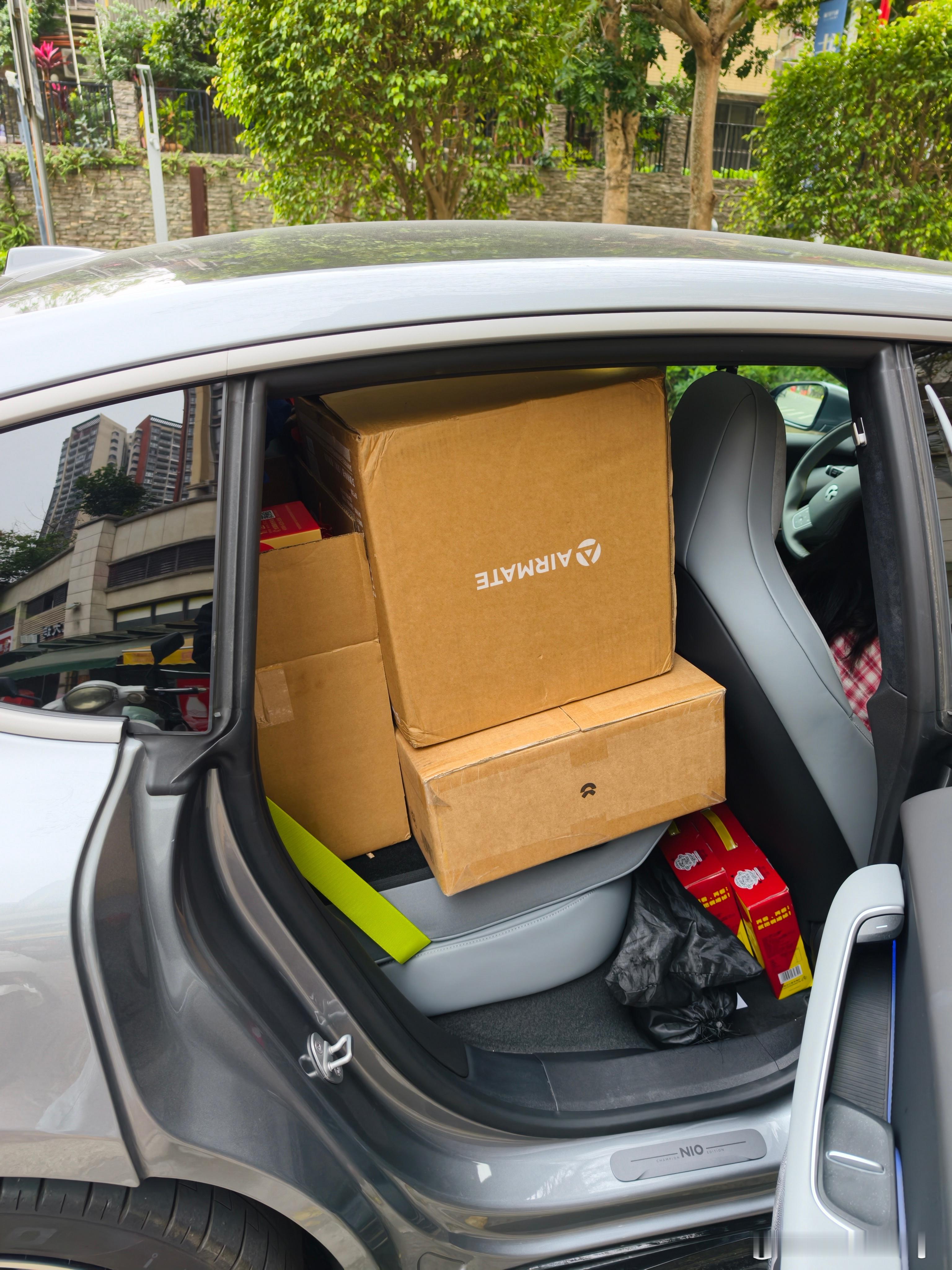 4、关于装载方面,今年回家我没想到领导买了 N 多东西回去,床垫、各种礼盒、零食、我还买另一个蔚来的炒锅,本来还担心 ET5 塞不下,但最终满满当当的,全部塞进了后备箱和第二排。也好在我们是两个人出行,否则真的装不下。