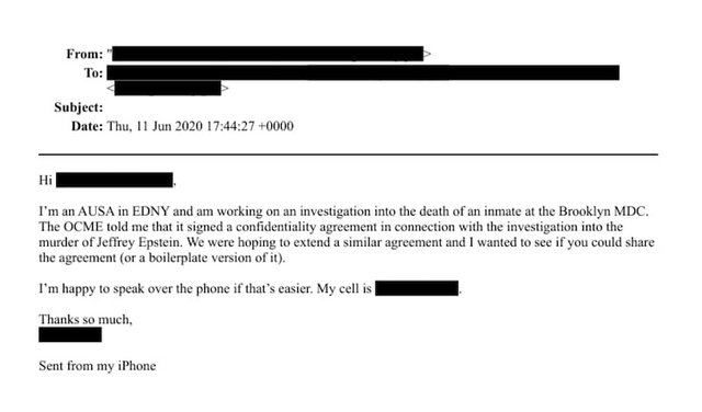 报道称,这封邮件日期为2020年6月11日,邮件中一名自称“AUSAinEDNY”——可能是“纽约东区联邦助理检察官”缩写——的人,提到了所谓“对杰弗里·爱泼斯坦谋杀案”的调查,“我是纽约东区联邦检察官办公室的助理检察官,目前正调查布鲁克林区大都会拘留中心一名囚犯的死亡事件。”邮件中写道。报道提到,美司法部已将发件人和收件人的信息均隐去。