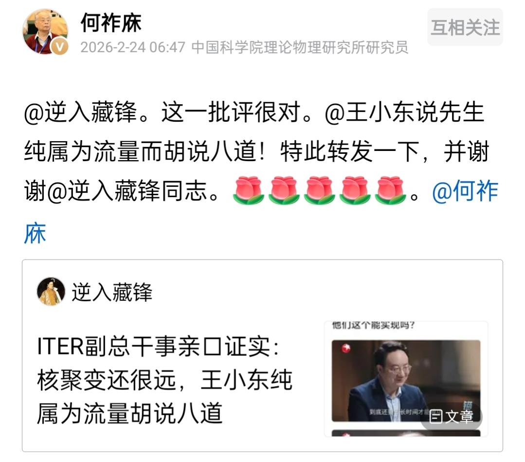 何祚庥老院士怒批王小东。 春节前,王小东先生接连制作了十多个视频,与何祚庥老院士展开辩论。当时何院士家中贵客来访,无暇回应。 近日,何祚庥老院士针对王小东先生的相关视频作出评价,仅用十一个字:纯属为了流量而胡说八道。 何老院士与王小东先生本是朋友,王小东曾称二人是君子之交。此前,何老院士曾劝王小东不要批评胡适,王小东不听老友良言;何老院士又提醒他在核物理问题上谨言慎行,王小东心生不满,随即制作视频进行反驳。 关注二人近期争论的网友都清楚,是王小东先发布视频,言语失当,并未就事论事。之后他又借煮蛋器、物理题等话题谈论何院士。 令人惋惜的是,两人的友谊在这场争论中逐渐破裂。不少网友希望王小东能登门拜访,理性沟通、就事论事,不要让矛盾影响情谊,可王小东仍称二人只是君子之交。 希望王老先生能趁着元宵佳节未至,效仿古时廉颇,主动登门拜访老友,让两位老人重归于好,也能成为一段佳话。