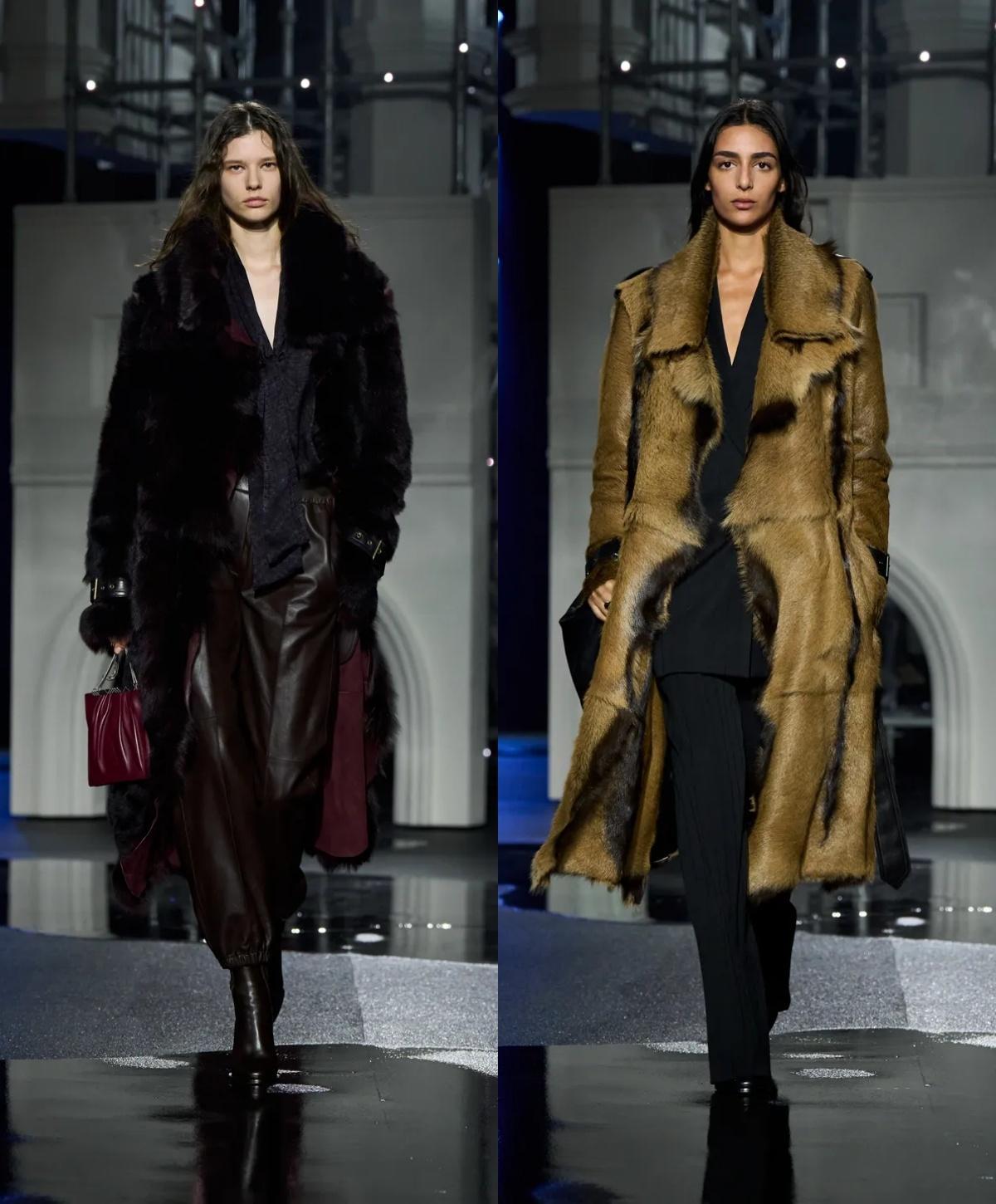 女装部分: 强调“毫不费力的优雅”。如果说男装强调的是力量与轮廓,那么女装则展现了Burberry特有的“松弛感”。风衣作为配饰披在缎面裙上;面料注重触感(未修饰羊毛皮、罗缎领口、虹彩光泽羊羔皮),展现了极高的触觉敏感度,既颓废又迷人,充满了感性的张力。