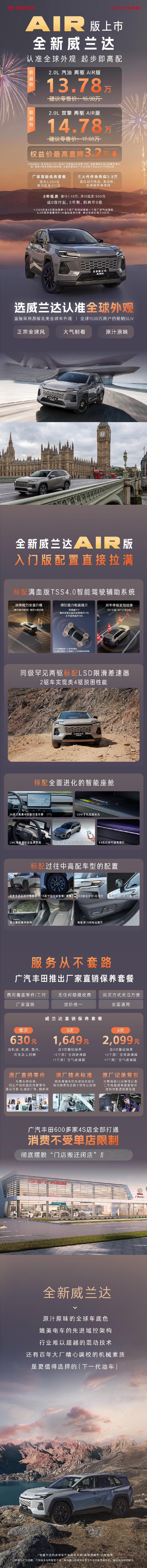 威兰达是全球车型的外观,广汽丰田的大厂品质有口皆碑。现在威兰达AIR价格直接是击穿底线,厂补国补叠加优惠,权益价来到13.78万-14.78万,首次进入13万级,性价比很高入门版配置全面拉满,过往中高配车型才有的高级皮质座椅、外后视镜折叠加热、50W 无线快充、64 色氛围灯等全部标配。广汽丰田发布厂家直销保养套餐威兰达AIR版上市13.78万起
