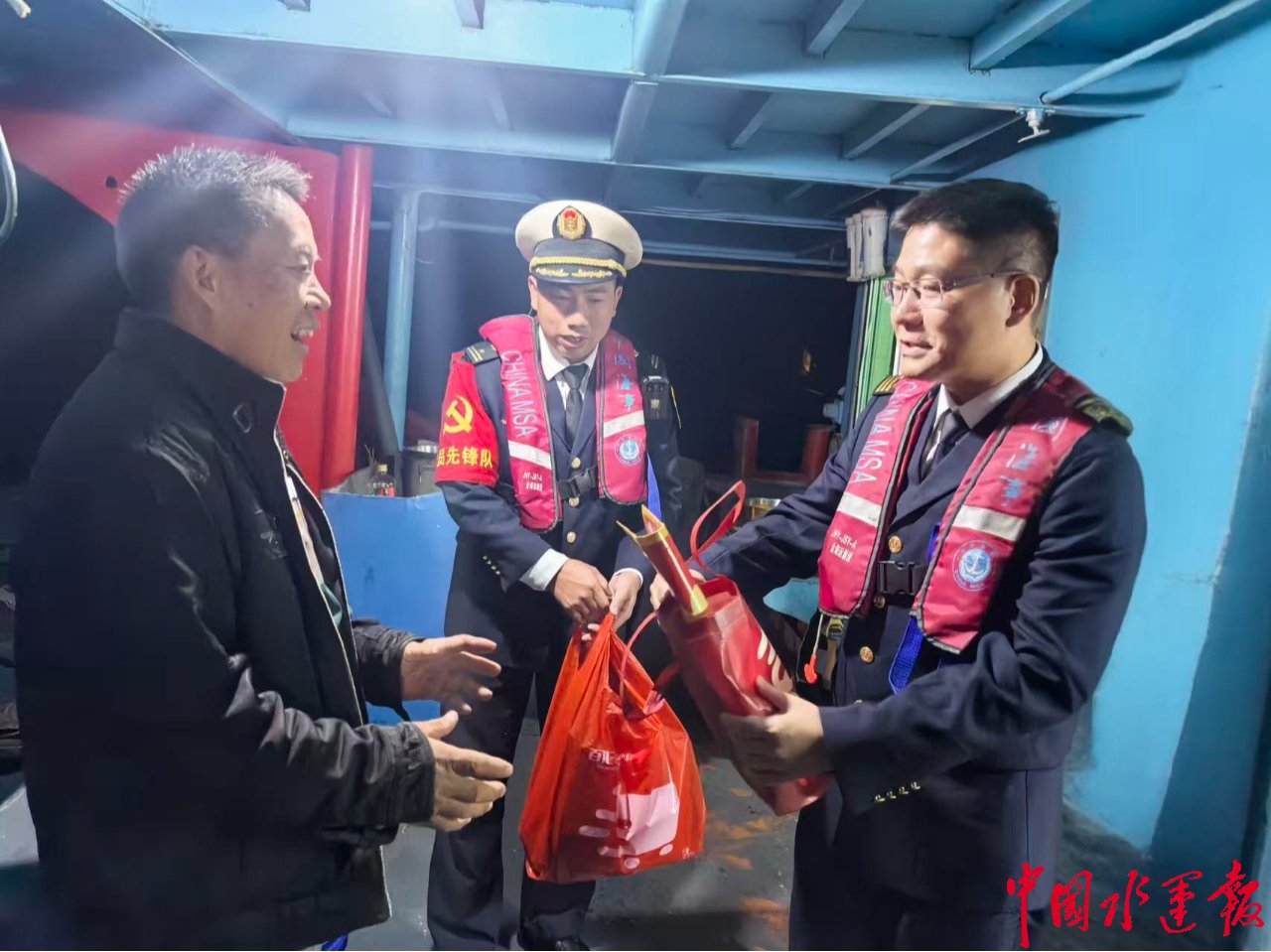 海事人员驾乘海巡艇前往乌石港区、锚泊区等重点水域,核查船舶锚泊、人员值守、无线电设备开启等情况。在乌石锚泊区,检查组登船向坚守在航运一线的船员朋友致以新春慰问与节日祝福——发放春联、福字、手套。并叮嘱船员做好值班值守,欢欢喜喜过年,平平安安开航。