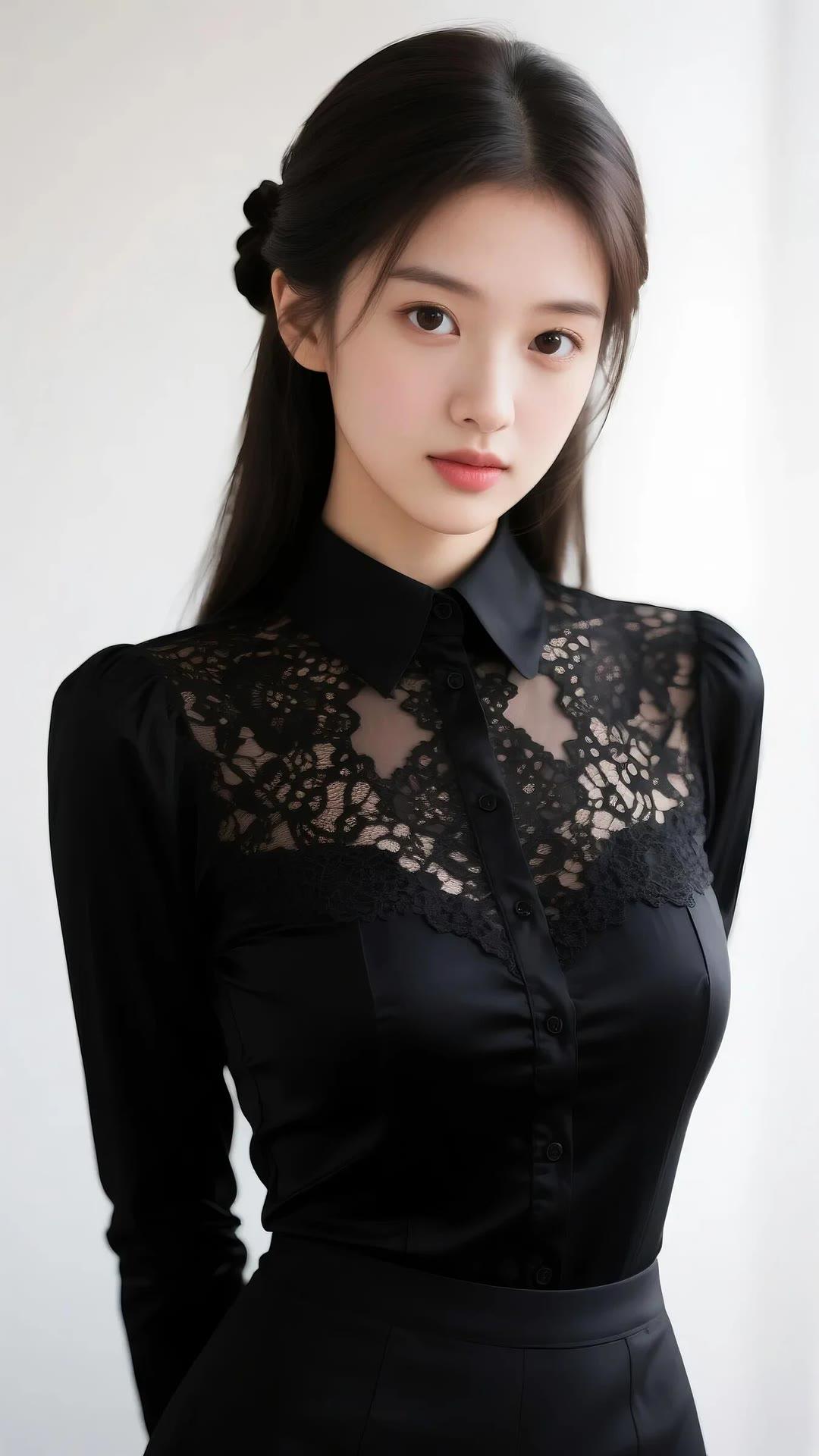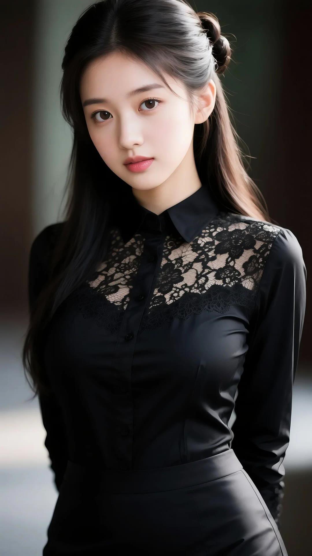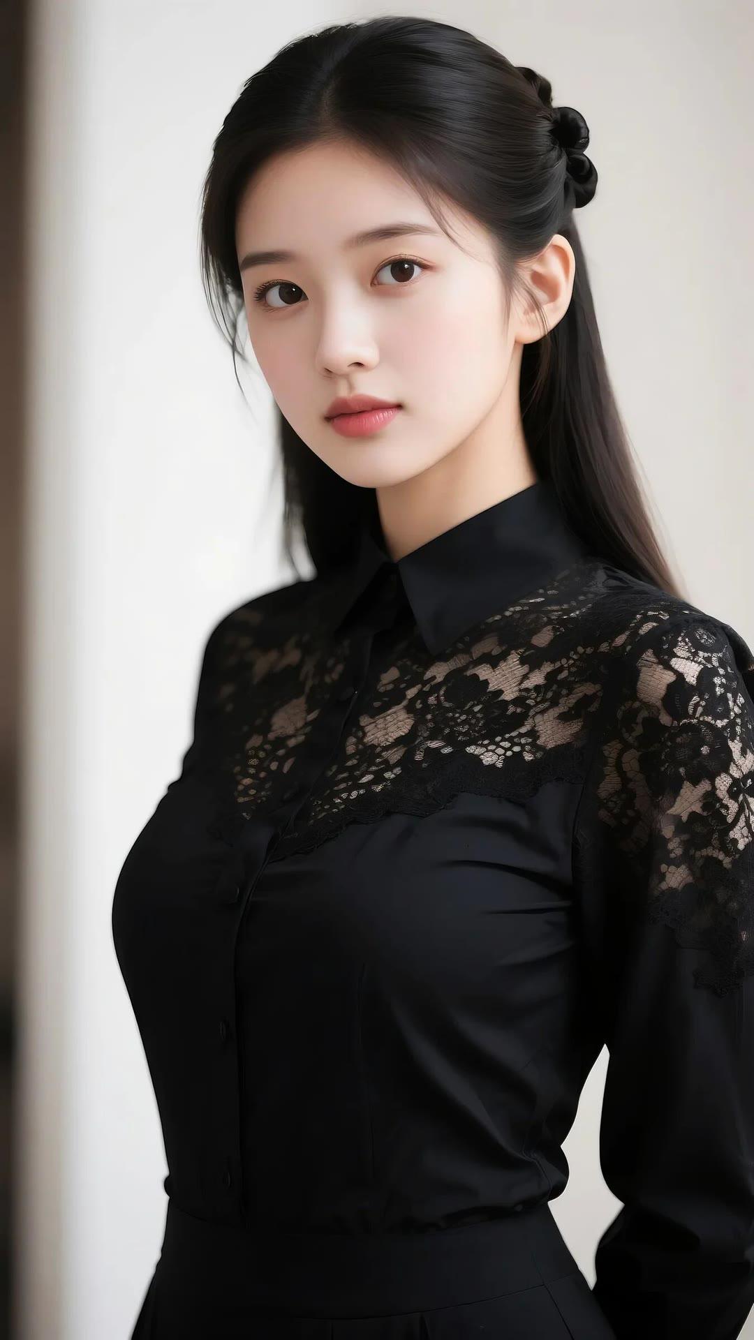 优雅黑衣少女,蕾丝细节,温柔眼神,时尚穿搭