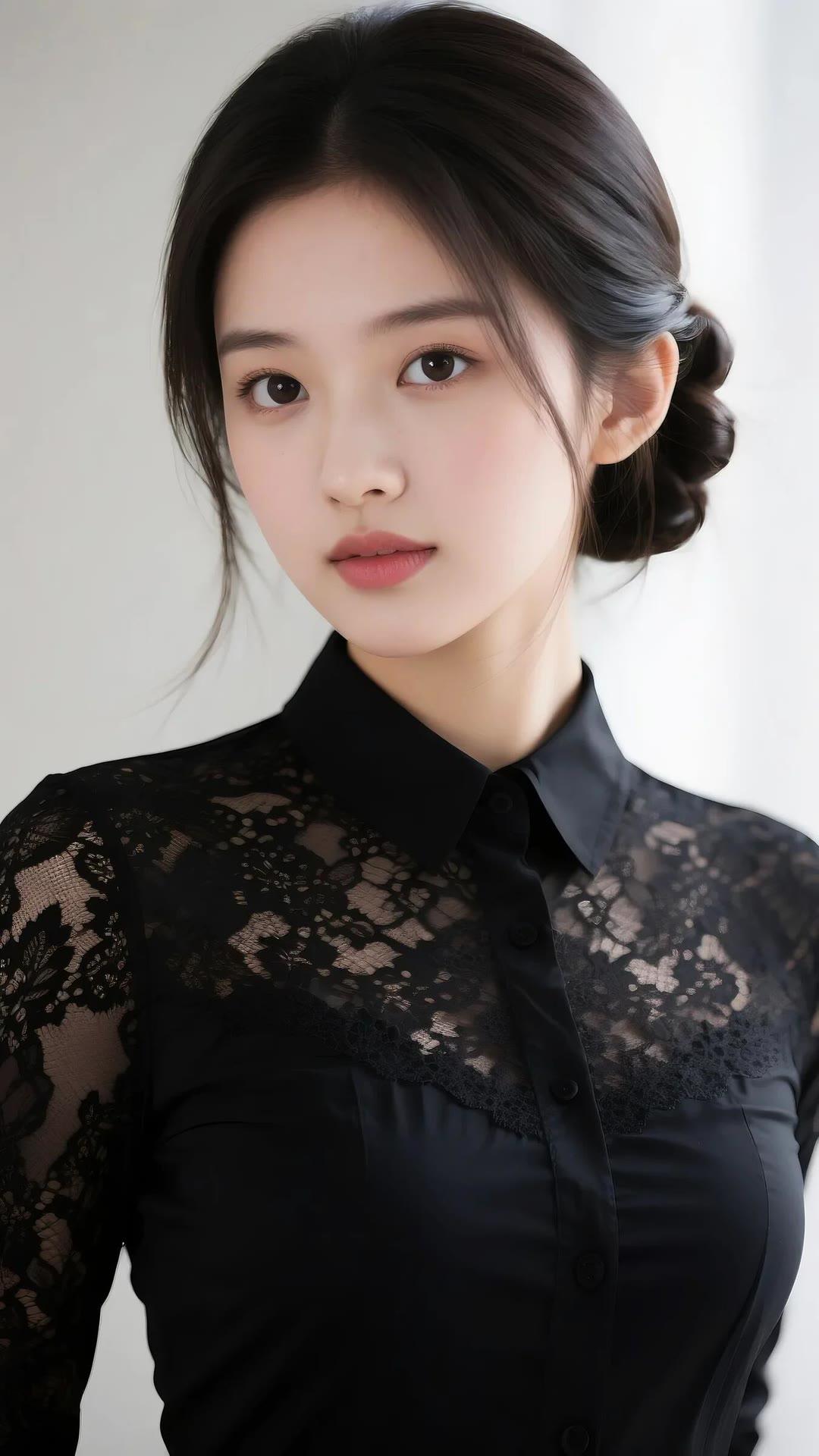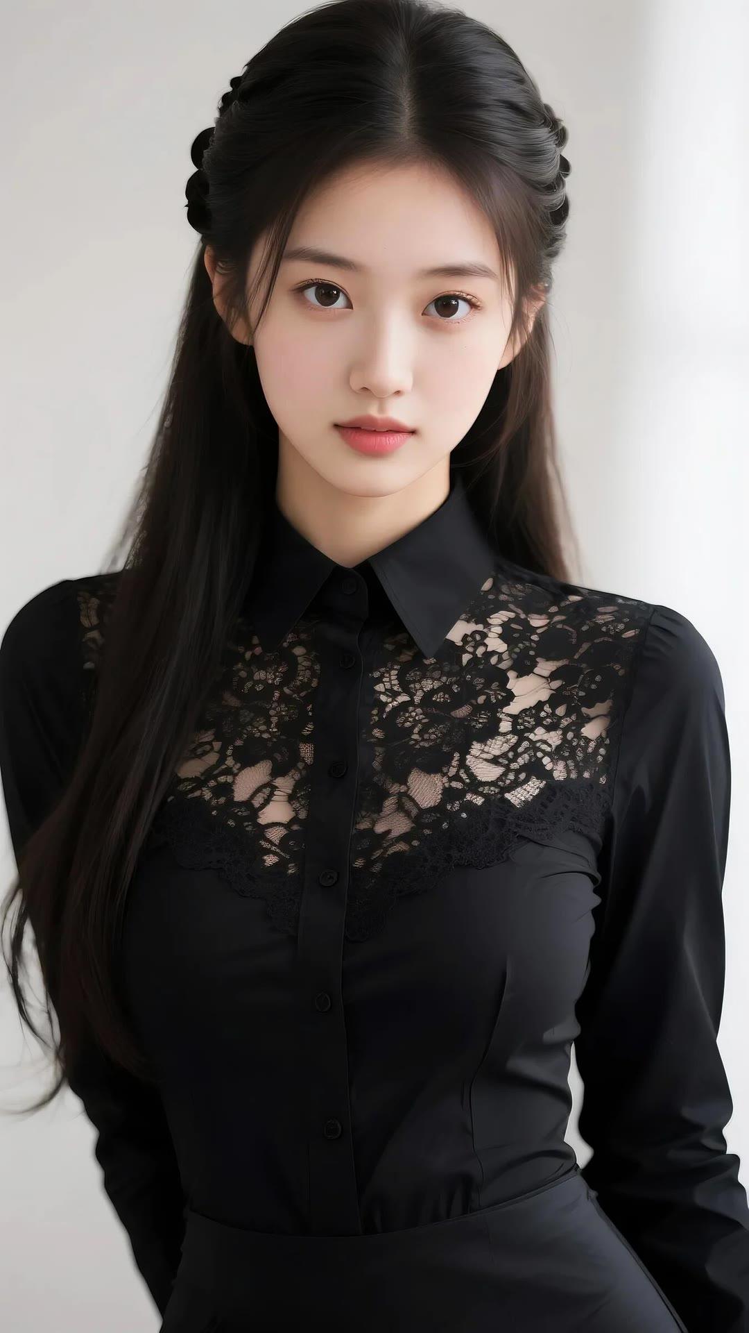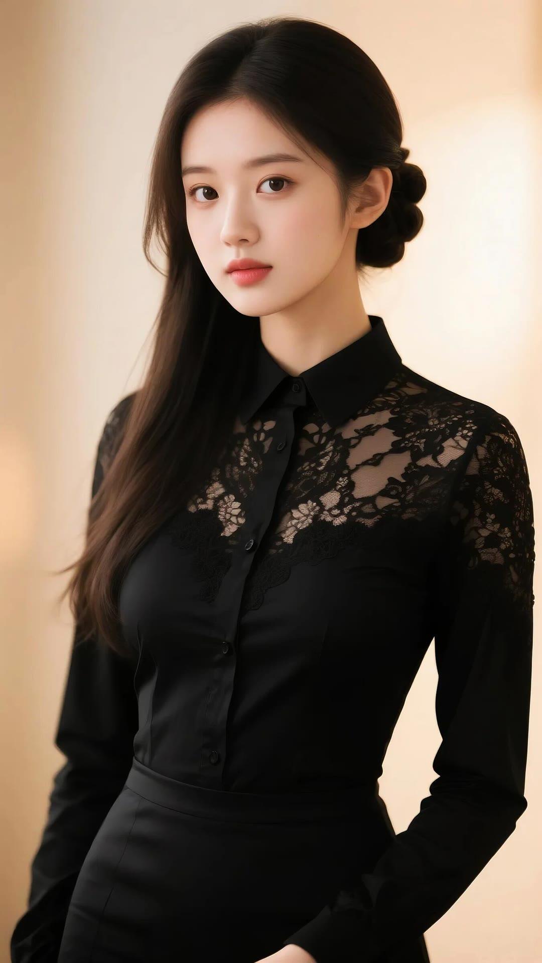 优雅黑衣少女,蕾丝细节,温柔眼神,时尚穿搭