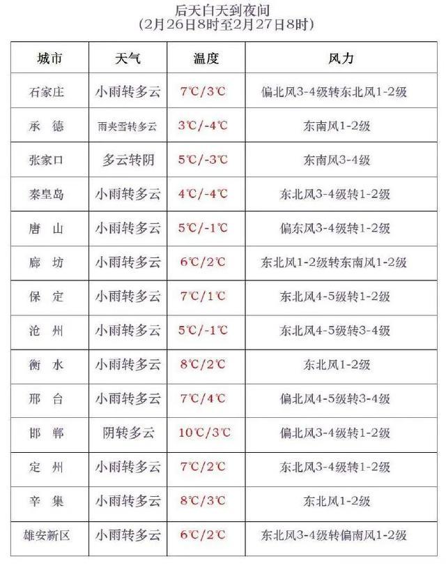 明天夜间到26日,保定中东部、雄安新区、廊坊、唐山南部、秦皇岛南部和石家庄、沧州及以南地区多云转阴有小雨,张家口中北部、承德中北部多云,其他地区多云转阴有小雪或雨夹雪,局地有中到大雪。