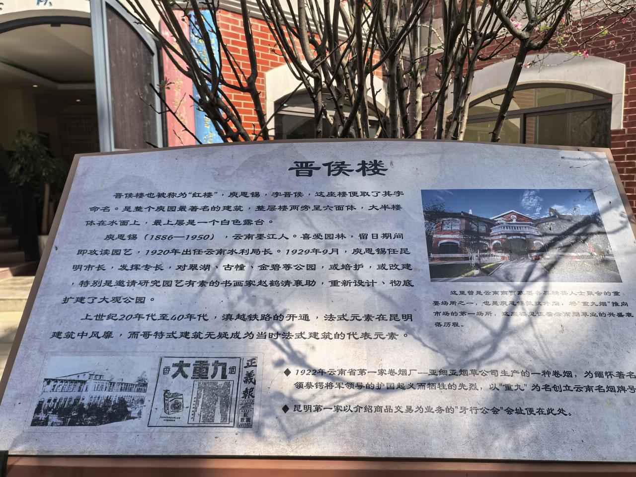 大观楼公园大观南园边上这里 有着中国“第一红楼”的建筑,是瘐恩锡建的按哥式风格建造的住宅。 廋恩锡曾任昆明市市长,云南省水利局局长等要职,瘐恩锡字“晋侯”,这座建筑也叫晋侯楼。 在当时这幢住宅楼也是非常有名的建筑,住宅楼的后面有一部分还是建在水上,同时也建了大落地窗,大窗户。门口有好几7株云南省重点保护古树圆柏,四周还有许多上百年老古树,侧柏及圆柏,侧柏与雪地松。 这里也是当时云南昆明政商的重要聚会场所,也是云南香烟“大重九”走向外面的发源地。当时的云南省第一家卷烟厂亚细亚卷烟⺁就是把当时的“重久”香烟由此推向全国市场!