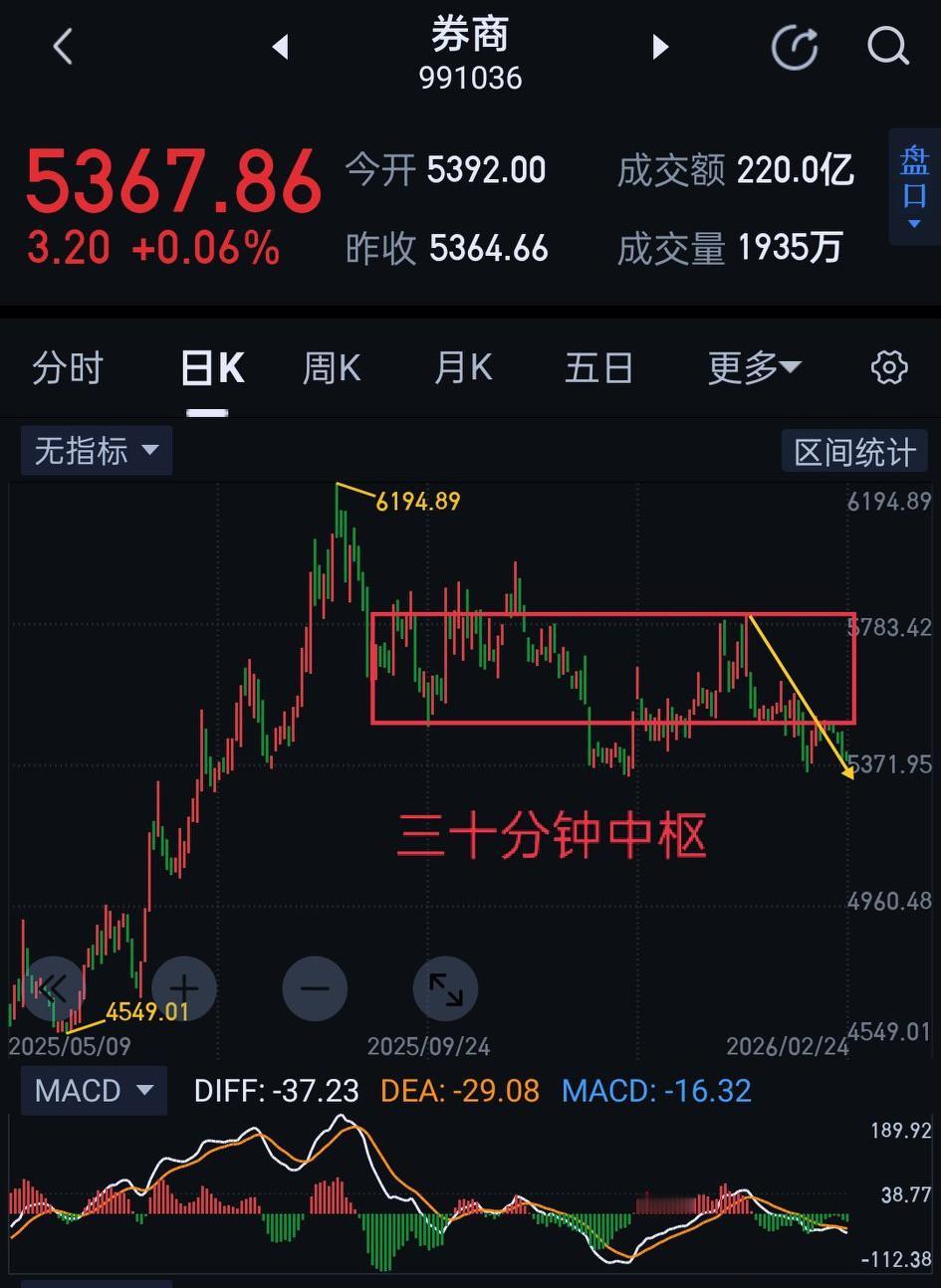 券商板块,今天继续挑战持仓者的心理防线。周三,券商将面临背水一战。明天能否站稳5364是关键。站稳,从5500开始的三十分钟一笔下将会结束,图〈1〉中的五分钟级别二买点将会形成。如不能站稳,阶段性低点5317也将变得岌岌可危,要防止形成图〈2〉三十分钟中枢向下离开段。图〈1〉、图〈2〉的黄色箭头属于未完成走势。