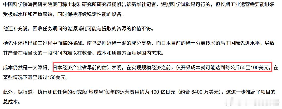 再看日本,根据日本经济产业省早期的估算,其深海开采成本就在50-100美金,极端情况下甚至超过150美金。算上“地球号”研究船每年100亿日元(约6400万美金)的刚性运营支出,折算到单位产量上,成本起码是国内的10倍以上。