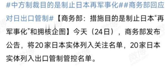 马年第一刀!不止20家日企进入黑名单,还有20家被“重点关注”! 马年上班第一天,商务部送出了一份“硬核大礼”,直接给日本军工来了个“精准点穴”。在发布管控公告后,商务部还在答记者问中明确指出,除了20家日本实体被拉进“管控名单”,还有斯巴鲁20家日本实体上了“关注名单”,理由是:它们无法核实两用物项最终用户、最终用途。 两用物项是指既可以用于民用生产生活,也可能被用于军事领域、大规模杀伤性武器研发的物资与技术,对这类物项实施严格出口管制,是世界各国的通行做法,核心目的是防止相关物资被违规滥用,维护地区和全球的安全稳定。 我国早已构建起完善的出口管制法律体系,2020年出口管制法正式施行,2024年12月1日两用物项出口管制条例落地实施,所有监管行动都有明确的法律支撑,完全符合国内法律规定和国际通行规则。 商务部明确说明,将这40家日本实体分别列入管控名单和重点关注名单,核心且唯一的原因,是这些企业无法向我国监管部门提供两用物项最终用户、最终用途的有效核实材料。 我国监管部门无法确认这些企业进出口的两用物项最终会流向何处、被用于何种用途,存在被用于军事领域、提升日本军事实力的重大安全风险。 这种无法核实的状态,直接触碰了我国两用物项出口管制的核心要求,也不符合国际社会通用的监管标准,采取针对性监管措施是必要且合理的。 被列入管控名单的20家日本实体,其涉及我国两用物项的出口活动将受到严格限制,未经我国监管部门专门许可,不得开展相关贸易活动。 被列入重点关注名单的20家日本实体,我国出口经营者向这些企业出口两用物项时,不能申请通用许可,也不能以简单登记信息的方式获取出口凭证,必须提交详细的风险评估报告,同时要提供相关物项不用于提升日本军事实力的书面证明。 对于涉及日本军事用户、军事用途的出口申请,我国监管部门一律不予批准,全程执行最严格的审查标准。 我国对两用物项的出口管制,始终坚持一视同仁、依法依规的基本原则,不针对任何特定国家,也不针对特定行业。 所有与中国开展两用物项贸易的企业,无论来自哪个国家、属于哪个行业,都必须遵守中国的法律法规,都必须配合监管部门完成最终用户和最终用途的核实工作。 此次针对日本部分企业的管控措施,是基于企业自身合规情况做出的正常监管行为,没有任何随意性,更不是针对性的限制。 这些被列入名单的日本企业,核心问题出在自身合规管理不到位,没有建立完善的两用物项流转、使用核查机制,无法满足我国的监管要求。 面对我国的管控措施,这些企业最该做的是立即整改内部管理流程,主动向我国监管部门提供真实、完整、可核查的最终用户和最终用途证明材料,尽快消除安全风险。如果持续无法提供有效核实材料,相关的严格监管措施会持续执行,不会随意放宽。 此次商务部的管控行动,是马年我国维护国家安全和地区和平稳定的首个重要监管举措,向所有境外企业传递出明确信号:中国的出口管制规则不容挑战,两用物项的安全底线不容突破。 这一行动也彰显了我国作为负责任大国,主动履行国际防扩散义务、防范军国主义死灰复燃的坚定决心。当前亚太地区安全形势复杂敏感,严格管控两用物项,既是守护我国自身安全利益,也是维护地区和平稳定的必要举措。 我国会持续完善两用物项出口管制体系,不断提升监管的精准性和有效性,对所有违反管制规定的企业保持零容忍态度。 对于能够主动整改、满足监管要求的企业,我国会依法依规恢复其正常贸易资格;对于拒不整改、持续违规的企业,我国会依法采取更严厉的处罚措施。 我国始终坚持开放合作,欢迎所有合规企业与中国开展公平贸易,但绝不允许任何企业无视中国法律、危害国家安全和地区稳定。 马年第一刀,砍的是违规行为,守的是安全底线。商务部针对日本40家实体的管控与重点关注措施,每一项都有明确法律依据,每一步都基于真实合规问题,合法、合理、必要。 这一行动清晰表明,中国有决心、有能力守护国家安全底线,有责任、有担当维护地区和平稳定。遵守中国法律,就能享受公平合作的机会;无视监管规则,就必然受到严格约束,这是中国的坚定立场,也是维护全球和平与发展的必然选择。