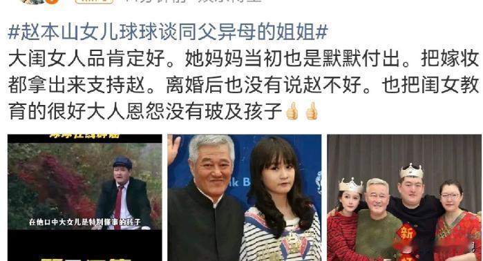 赵本山女儿,冲上热搜! 2月22日下午,赵本山女儿球球,突然冲上热搜,原因在直播时,球球说起了同父异母的姐姐赵玉芳。 说白了,球球这波冲上热搜,根本不是啥惊天动地的家庭矛盾大曝光,就是网友们看惯了豪门争产的戏码,少见多怪罢了,搁普通人家里不值一提的事,搁赵本山家里,就被翻来覆去地解读。 2月22日下午,球球直播正聊得热火朝天,有网友突然刷屏问起她同父异母的姐姐赵玉芳,本以为她会打太极绕过去,没想到球球大大方方接了话,也正因为这几句坦诚的回应,直接把自己送进了热搜榜单,引来了一群网友的围观和猜测。 有人说姐妹俩关系不好,有人说赵本山偏心,吵来吵去闹得挺热闹。 其实我感觉这也没啥奇怪的,大家就是过度解读了。 球球的后妈马丽娟是戏曲学校的老师,陪着赵本山一路打拼,在圈子里也有一定的人脉和分量,而球球的亲妈,也就是赵本山的前老婆葛淑珍,本来就是个地地道道的村姑。 当年和赵本山结婚的时候,赵本山还没出名,她就是个本本分分靠丈夫挣钱养家的家庭妇女,性格朴实又内敛。 后来赵本山爆红,成了家喻户晓的“小品大王”,财大气粗的样子,葛淑珍哪敢跟人家争什么、比什么? 说穿了,她就是老老实实在家带着孩子过日子,不用费心思争抢,随便从赵本山这口“大锅里”挖几勺子,就够她们母女俩过上大富大贵的暴发户生活,犯不着为了名利闹得鸡飞狗跳。 而且赵家之所以没出现大家预想中的家庭矛盾,核心就俩字:有钱。 老赵这辈子挣的钱,早就够家里几代人衣食无忧了,不管是大女儿赵玉芳,还是小女儿球球,在经济方面根本不用操心,老赵不仅不用让儿女们养老,反而还能时不时贴补他们,给她们铺路。 更关键的是,老赵有儿子赵一楠,也就是球球的双胞胎哥哥,按照咱们传统的观念,财产继承方面,儿子就是正主,后续家里的核心产业大概率都是要交给赵一楠的,另外两个女儿,不管是赵玉芳还是球球,其实就是听分配就完事了,没有争夺的必要,也没有争夺的意义。 不信你们琢磨琢磨,普通家庭为啥矛盾多?无非就是两件事,要么是父母养老看病,兄弟姐妹之间互相推诿,争论谁出钱多、谁出力少;要么就是父母去世后,财产分配不均,你多拿一点我少拿一点,闹得反目成仇。 说到底,就是没钱闹的,要是都跟老赵家里一样有钱,啥矛盾都能迎刃而解。 还有人说球球这是在立人设,这话其实也有几分道理。 咱们都知道,人设这东西,从来都是自己立的,每个人心里都有自己的小心思,真正的心思,都是藏在心里不轻易说出口的,哪会当着直播间几千上万人的面,故意往外说? 球球当着这么多人的面聊姐姐,我感觉就不是单纯说心里话,就是在立一个“通透懂事、姐妹和睦”的人设,既回应了外界的猜测,又能收获一波好感,一举两得。 当然了,以上这些都只是我个人的看法,不代表事实本身,毕竟赵家的真实相处模式,只有他们自己最清楚。不知道大家怎么看这件事?觉得球球是真的坦诚,还是在立人设?欢迎在评论区留下你们的想法。