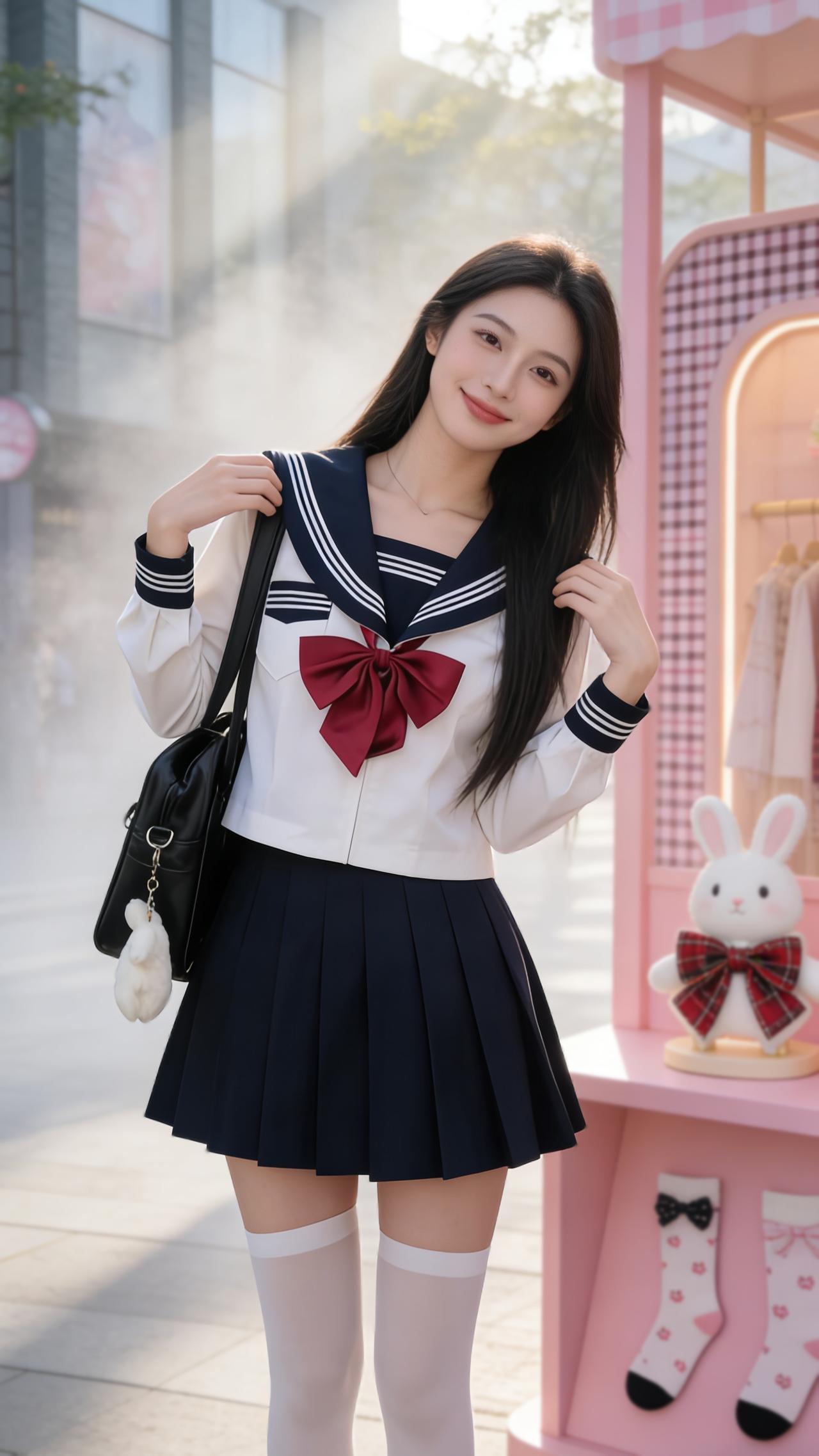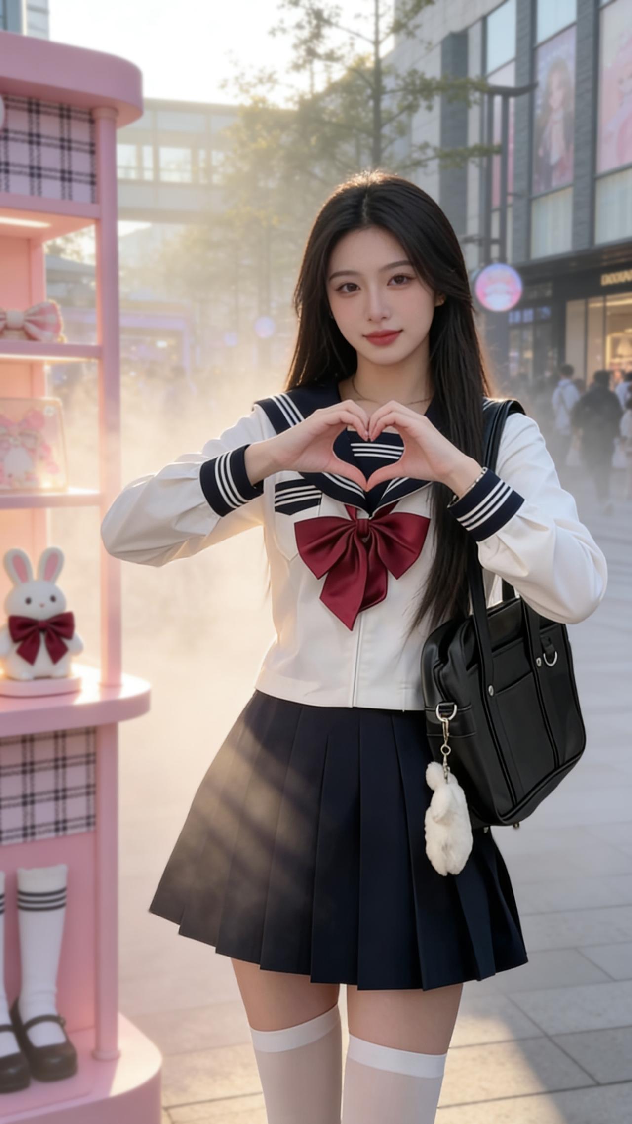 米白毛绒外套搭配浅蓝牛仔裤,再叠穿黑色长袜与亮面短靴,粉色背包点亮整体,冬日街头
