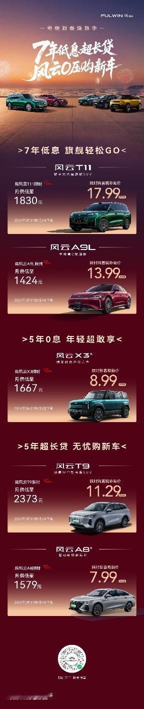 初七启新程,奇瑞风云的“0压”,才是新年最实在的豪华平权! 正月初七,春意破土,正是整装待发的好时节。在这个寓意生机的日子里,奇瑞风云开启的新春焕新季,让我真切感受到:中国品牌的“豪华平权”,早已从口号变成了触手可及的实惠。 作为奇瑞新能源的核心力量,风云此次推出的“7年低息超长贷”政策,精准戳中了消费者的购车痛点。每天不到50元就能开上旗舰插混轿车风云A9L,60元左右即可坐拥风云T11的百万级豪华空间,再叠加至高2万元购置税补贴、2000元新年红包,以及整车加三电终身质保,这份“真金白银”的诚意,彻底打消了购车的后顾之忧。 这份底气,源自风云2025年的硬核成绩单,A9L累计交付超5.5万辆,T11上市即跻身高端SUV市场前三,多项权威大奖加身,见证了中国品牌的品质实力。在我看来,风云的成功不在于堆砌配置,而在于让普通家庭无需妥协,就能享受全球品质的绿色出行。 新年新征程,不必为购车压力驻足。趁此新春焕新季,入手一台奇瑞风云,让全球品质座驾伴你策马扬鞭,奔赴2026年的每一场美好奔赴。