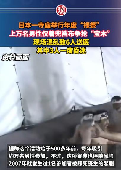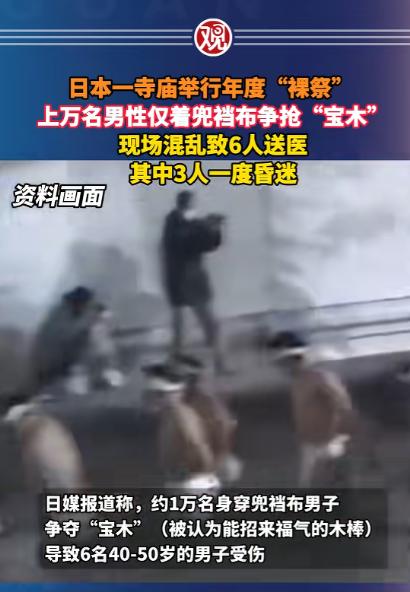真是一个淫乱变态的民族啊!而且不以为耻,反以为荣。   就在前几天,2月21日深夜,日本冈山县西大寺观音院,一场号称传承 516 年的 “会阳节”,彻底变成了惊魂现场,近万名男人的疯狂争抢,把所谓的 “祈福仪式”,演成了一场毫无底线的病态闹剧。 这场被日本列入重要无形民俗文化财的传统活动,在每年二月下旬如期举办,最早可以追溯到十六世纪初期的室町时代,原本是当地民众祈求来年五谷丰登、家人平安的祭祀仪式。 经过数百年的流传,逐渐固定成以争抢 “宝木” 为核心的祭典形式,也是日本国内知名度最高的裸祭活动之一。 按照当地的习俗,只有完成全套净身流程的男性,才有资格进入核心场地参与争抢,这也让不少参与者把这场仪式看得格外郑重。 深夜十点前后,气温还处在个位数的寒夜里,近万名男性陆续抵达西大寺观音院的外围,他们按照传统要求褪去日常衣物,只在腰间缠绕一块制式统一的兜裆布,手里攥着一小块擦身用的棉布,成群结队地朝着寺庙院落移动。 在进入核心区域前,所有人都要完成冷水净身的环节,工作人员会用冷水泼洒在参与者身上,寓意洗去身上的污秽,以洁净的状态接近神明、承接福气。 冰冷的水流打在身上,不少人下意识地蜷缩身体,却还是咬牙坚持完成流程,跟着队伍缓慢绕着寺院行走,沿途还有僧侣低声诵经,现场还保留着祭祀该有的肃穆感。 寺院的核心院落面积并不算大,平日里用来容纳香客尚且宽松,可当近万人同时涌入,整个空间立刻被填得密不透风,人与人之间几乎没有空隙,前胸贴着后背,手臂只能勉强抬到胸前,想要转身或者挪动脚步都变得异常困难。 现场只布置了少量临时照明设备,昏黄的光线在人群缝隙里忽明忽暗,寺院二楼的平台上,负责仪式的僧侣已经就位,手里捧着两根长度约二十厘米的宝木。 这是整场祭典最核心的信物,在当地传说里,抢到宝木的人能够一整年被福气环绕,事业顺遂、家庭安康,这份寓意也让现场的情绪越来越亢奋。 僧侣完成最后的祈福诵经后,现场的灯光短暂调暗,这是争抢环节即将开始的信号,人群瞬间安静下来,所有人的目光都死死盯着二楼平台,身体不自觉地向前攒动,原本就拥挤的空间变得更加紧绷。 随着僧侣抬手将宝木抛下,安静的现场瞬间炸开,嘶吼声、喘息声、肢体碰撞的闷响混在一起,近万人同时朝着宝木掉落的方向涌去,彻底打破了所有秩序。 没有人再顾及礼仪和规则,所有人都被争抢的本能裹挟,前面的人被后面的人推着向前扑倒,后面的人又踩着前面人的身体往上挤,手臂、肩膀、膝盖互相抵撞,有人的兜裆布被扯歪,有人手里的棉布掉落在地上被人群踩扁,还有人被挤在角落动弹不得,只能任由人潮来回冲撞。 狭小的院落里,人浪一层叠着一层,空气变得浑浊闷热,即便身处寒夜,不少人还是满头大汗,呼吸都变得急促,有人张大嘴巴拼命吸气,却还是被密集的人群堵住了气流通道。 现场的安保人员和工作人员早就被人群冲散,零星几个守在边缘的工作人员试图伸手拉拽失控的人潮,可在近万人的力量面前,这点阻拦根本起不到作用,只能眼睁睁看着场面越来越混乱。 有人在推搡中摔倒,刚想爬起来就被后续的人群踩中,只能蜷缩在地上护住头部,呼喊声被嘈杂的声响淹没,原本用来祈福的神圣场地,此刻只剩下无序的冲撞和慌乱的躲避。 混乱持续了十多分钟后,现场终于出现了第一声求救的呼喊,有人发现身边的参与者脸色发白、嘴唇发紫,直接瘫软在人群里失去了意识。 工作人员立刻联系消防和急救部门,几辆救护车很快赶到寺院门口,急救人员带着担架和急救设备,艰难地拨开人群进入核心现场。 他们先是把昏迷的人抬到相对空旷的角落,进行简单的吸氧和心肺复苏,再小心翼翼地抬上担架,沿着临时开辟的通道送往救护车。 整个急救过程持续了近半个小时,急救人员一共从现场抬出六名伤者,全部送往附近的医院接受治疗。 等人群慢慢散去,工作人员清理现场时,满地都是烂布团、扯断的兜裆布边角,散落的手机、钱包、鞋子随处可见,还有不少新鲜的血渍,跟之前热闹的祭典氛围形成了刺眼的反差。 警方调了监控发现,从宝木被抛下到人失控,短短三分钟,现场的秩序就彻底崩了,9500 人的规模远超 200 平方米场地的承载极限。 这场传承了五百多年的祭祀活动,在往年也会出现轻微的拥挤和磕碰,但从来没有出现过如此严重的受伤情况,今年参与人数比往年多出近两成,再加上核心场地空间有限,人群情绪过度亢奋,最终让祈福仪式变成了惊魂现场。 对于这件事,您有什么想说的吗?欢迎评论区留言讨论。 信源:观察者网2026-02-22——《日本一寺庙举行年度“裸祭” ,上万名男性仅着兜裆布争抢“宝木”,现场混乱致6人送医,其中3人一度昏迷》