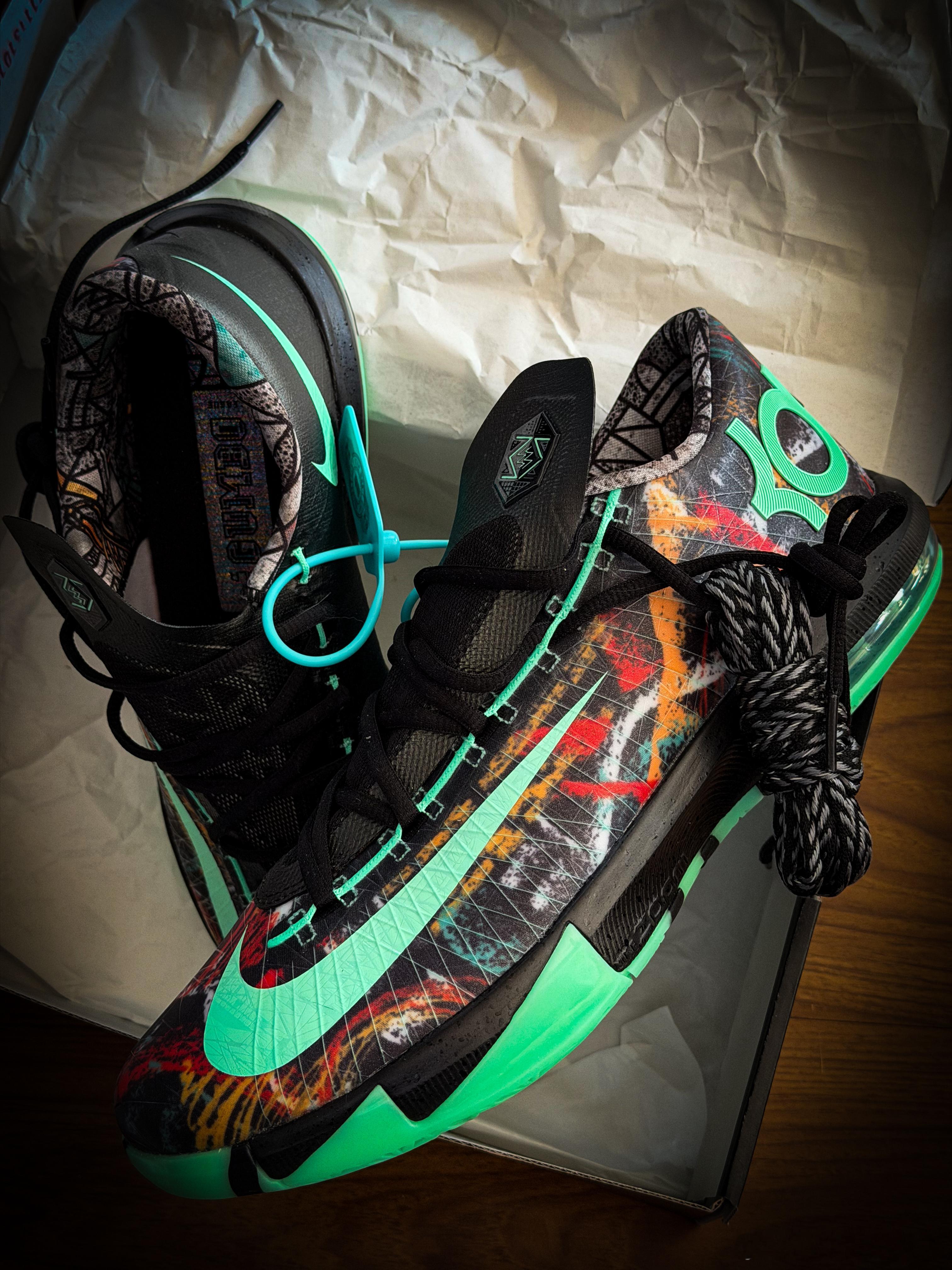 严格意义上来说我马年的第一双新鞋(虽然是在蛇年发售的)十几年前的鞋放在今天性能肯定不够能打球鞋主人也并不是我喜欢的 甚至有点反感但不得不感叹那个时候耐克的设计颜值和重量放在今天依旧能打(真挺轻的!)KD6元年的时候 各位鞋狗什么年龄?我应该是高一?鞋kd6
