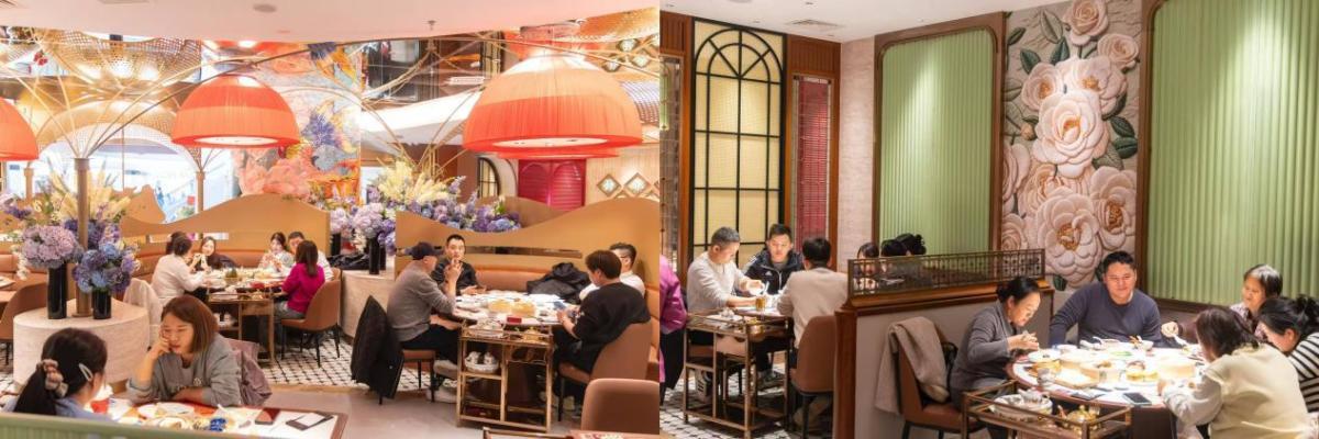 壁画上还绽放着优雅大气的粉黛牡丹,一只赤红鳌鱼在其间宛若游龙,既饱含中原的大气厚重,又有广府的灵动雅致,吸引不少食客驻足拍照。