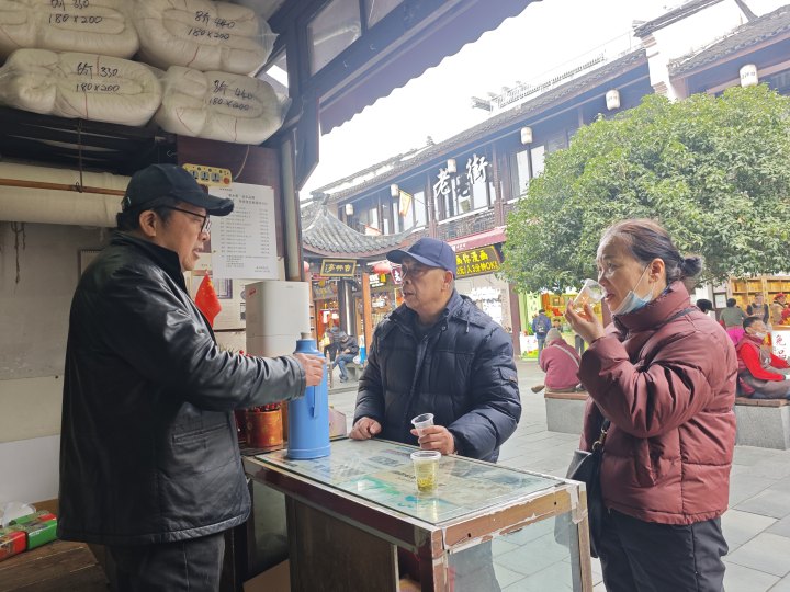 上午8点,河坊街还清冷,一些门店陆续开门,86岁的胡兰兰老太太掀开门板,出门张望,遇到吴山下来晨练的人,“早呀”“身体结棍”“天冷了,多穿点”“再会”……
