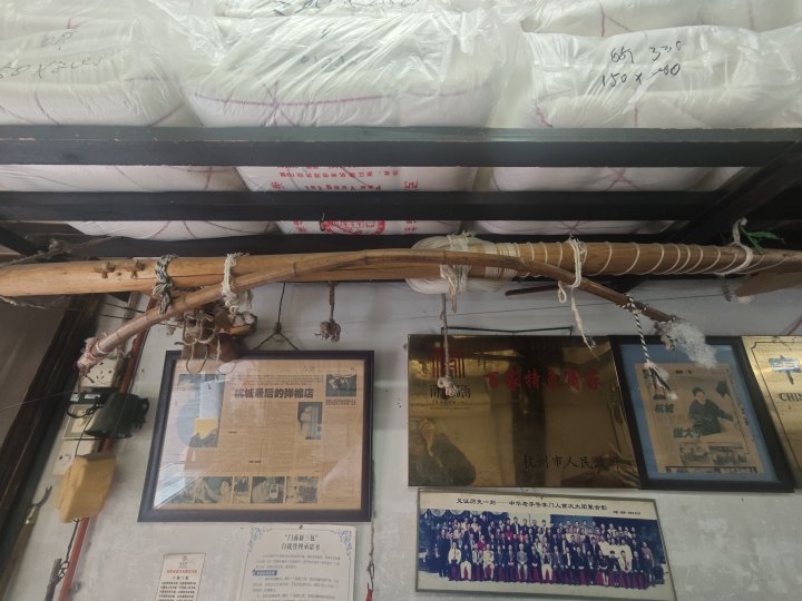 屋里布置还是过去的老样子,弹棉花用的门板床,墙柜上、棉板上堆着弹好棉花被样品。最里边堆着一台轧棉机,这是传家之宝,“1929年潘永泰家在第一届西湖博览会上获得大奖奖品。”墙上挂着报纸、合影、荣誉,老太太时常擦擦,看看。