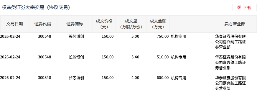 2月24日,长芯博创大宗交易成交12.4万股,成交额1860万元,占当日总成交额的0.46%,成交价150元,较市场收盘价165.58元折价9.41%。