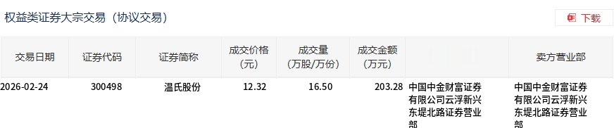 2月24日,温氏股份大宗交易成交16.5万股,成交额203.28万元,占当日总成交额的0.54%,成交价12.32元,较市场收盘价15.34元折价19.69%。