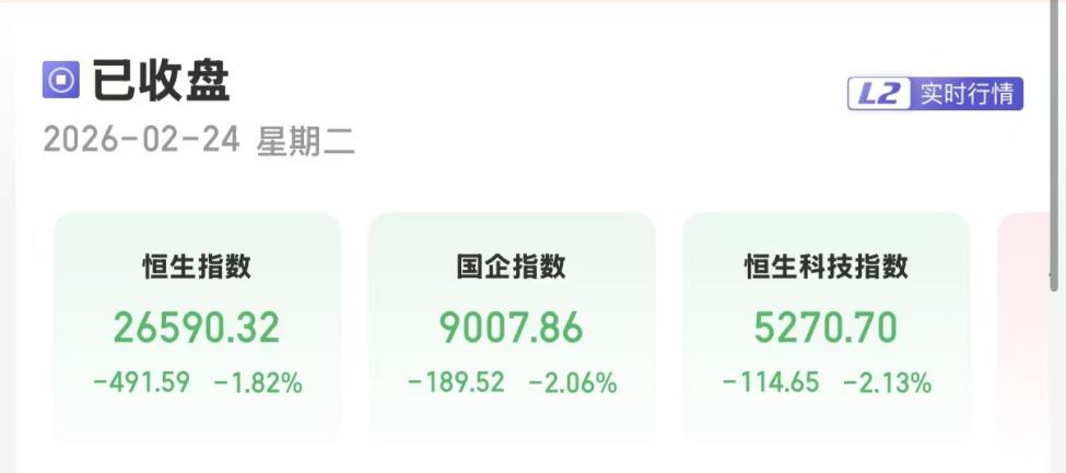 上证报中国证券网讯(卢伊记者严晓菲)2月24日,港股三大指数收跌。截至收盘,恒生指数跌1.82%,报26590.32点;恒生国企指数跌2.06%,报9007.86点;恒生科技指数跌2.13%,报5270.70点。