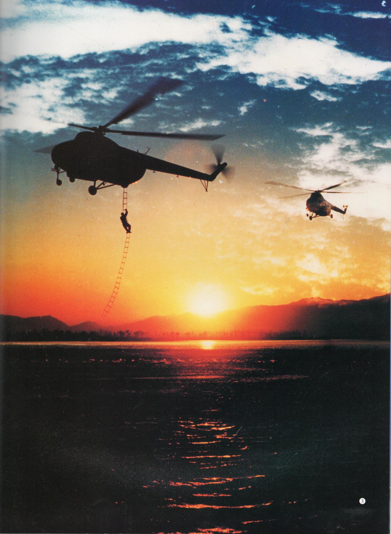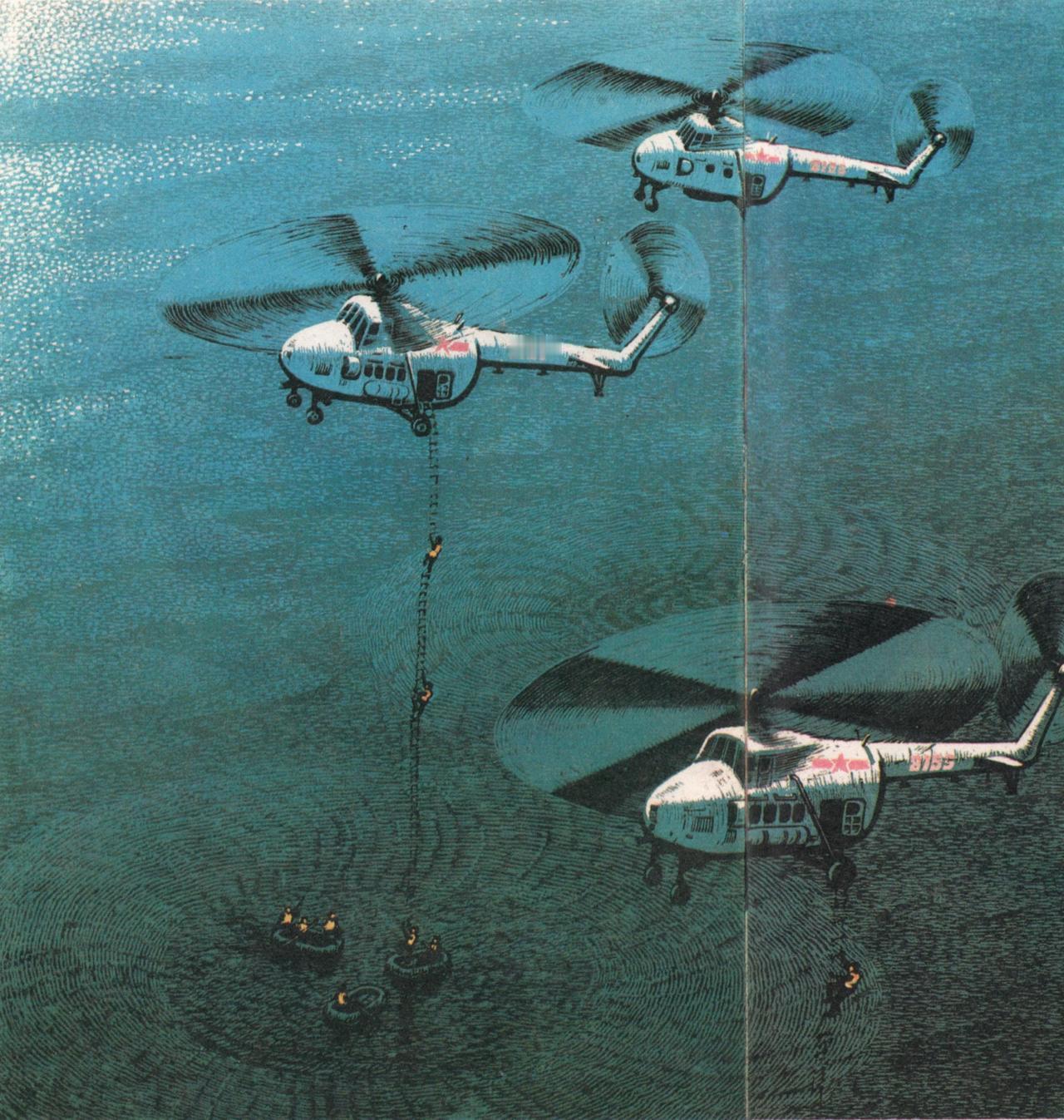 经典老飞机,我国第一代直升机——直五在夕阳的映射下,搭载战士进行海上救生训练。图二这张版画,也描绘了直五执行海上救生任务的画面。作为我国第一代直升机,采用活塞发动机动力,直五的性能比较落后,但是苦于国内能力的迟缓发展,在七十年代末法制直升机进入国内之前,这是仅有的选择。