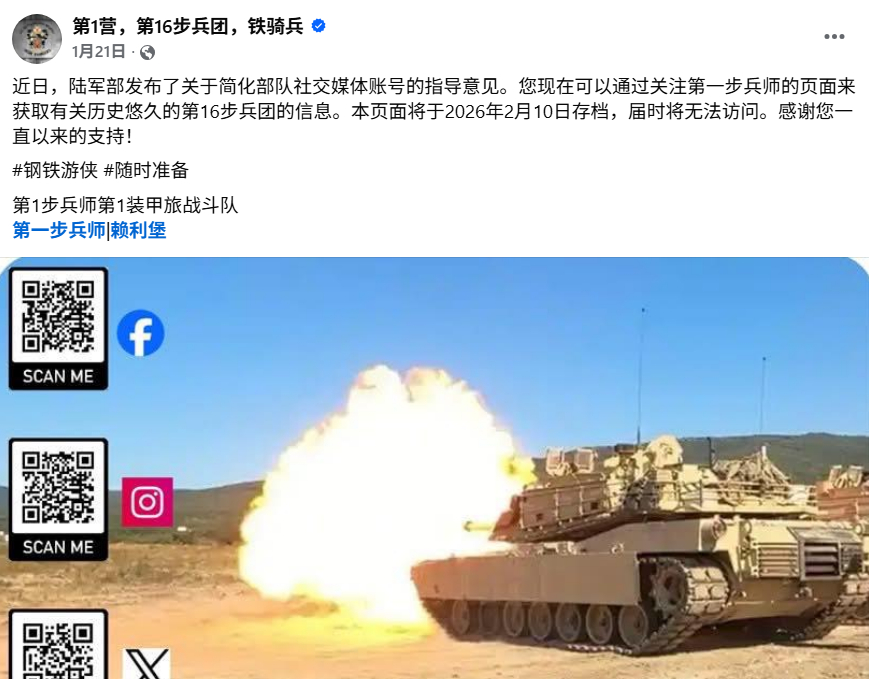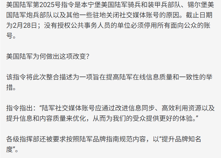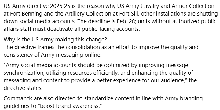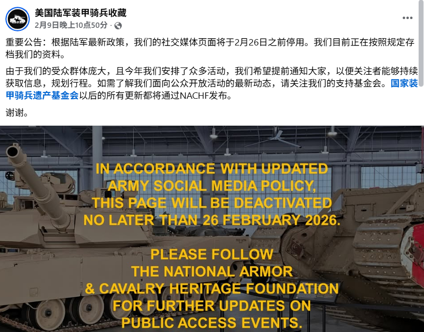 原本只是1月中美国陆军发布的行政令,要求没有公共事务部门的作战单位关闭社交公众号,结果都扩大到本宁堡博物馆官方号了,现在所有美军单位在2/28之前都将关闭社交账号,统一由公共事务部门官方发布。
