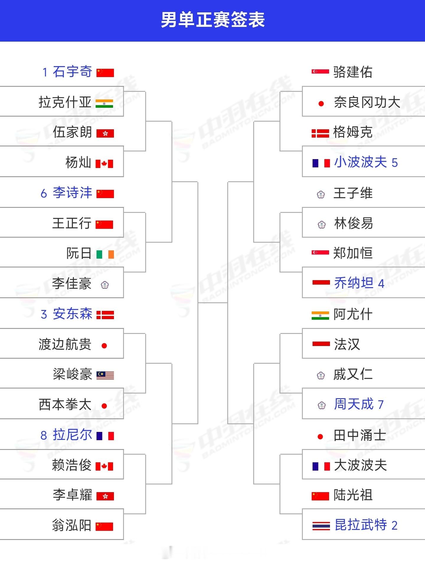 🟣男单(图1)石宇奇🇨🇳 vs 拉克什亚🇮🇳李诗沣🇨🇳 vs 王正行🇨🇳翁泓阳🇨🇳 vs 李卓耀🇭🇰陆光祖🇨🇳 vs 昆拉武特🇹🇭
