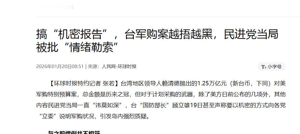台湾全岛无差别下跪了! 综合台媒报道,随着国民党主席郑丽文的明确表态,岛内各党派已经无差别向美国低头,对美“军购”案大概率将在节后无异议通过。虽然国民党、民众党故作姿态,犹抱琵琶半遮面,但实质上是不抵抗了。 事情得从去年年底说起,那时候民进党当局一股脑甩出个1.25兆新台币的特别预算,声势浩大,说是要买美国武器来壮胆。 赖清德团队领头,联合岛内各方势力,硬是要把这笔钱塞进立法机构过关。 表面上看,这事是为了岛上安全着想,可大家心里都清楚,这背后是想抱紧美国大腿,顺便稳住自家位置。 民进党推得这么猛,联动美国那边各种渠道,直接把立法部门搞成传话筒似的。 整个过程从筹划到推进,动作频频,岛内舆论炸了锅,有人觉得这是卖力护岛,有人却嘀咕这钱花得冤枉。 蓝白两党起初可没闲着,国民党跟民众党联手,愣是把这案子封杀了十来次。 看起来像是要死磕到底,岛内不少人还以为终于有党派敢顶着压力站出来。 可风头转得飞快,黄国昌还没回岛,就先窜到美国那边串门子,美方安排得妥妥帖帖,他临走甩出个民众党版的军购方案,姿态低了点,距离美国拉近了好几步。 民众党这么一折腾,成了最早松口的那个,本来被捧为关键力量,结果眨眼就变调了。 国民党那边呢,外头看着是民进党的老对手,岛上最大反对势力,去年下半年那阵子封杀动作一个接一个,谁都记得。 可年刚过完,韩国瑜就跳出来说,新会期头等大事就是这军购案,紧接着,新主席郑丽文干脆把话说开,国民党要自己领头搞军购,还得有自家方案,积极跟美方聊聊。 早早放风要实质放行,这剧本谁写的大家心知肚明,郑丽文强调,国民党一向挺国防力量,可民进党总爱黑箱操作,不肯分享细节,也不让国会插手。 她直言,国民党要主导,帮岛上争到真正管用又合理的武器,还想直接跟美方对上话,因为当局藏着掖着,只好自己上阵问清楚。 这么一看,岛内三大党派齐刷刷变了样,民进党明摆着捧美国场子,蓝白虽表面各有套路,国民党喊自家版本。 民众党也跟着附和,可骨子里都选择了不扛到底,一开始还有点骨气,到头来全顺着美国节奏走。 各党嘴上分歧大,实际面对华盛顿压力,动作整齐划一,国民党批评民进党甩锅,让自己背黑锅,说这不是团结岛上的路数。 民众党也抱怨预算空洞,商购项目不明不白,整个过程像场大戏,表面热闹,里面的戏味浓。 为什么大家都扎堆上船呢?岛上安全环境紧巴巴,靠买美国武器就能稳当?其实这是当局老把戏,炒热威胁论,用大把钱哄美国开心,换点所谓安全感当政治本钱。 可真算算账,这钱值不值一目了然,过去十年,台当局对美军购年年涨,从2012年起,美国批的武器装备已超300亿美金。 可实际到手的远没预期多,好多还是美国旧货,名义先进,实则清库存赚翻天。 美方政客嘴甜支持岛上,重点自己腰包鼓,顺带搅浑台海水,捞够就闪人,台当局越配合,越被牵鼻子走。 不管民进党怎么美化,蓝白怎么装腔作势,这军购案本质上就是给美国送福利。 买武器真能保平安?只会让岛上战略自主溜走,把防务外包出去,民众越陷政治赌局深,最近岛内民调露馅,军购案一出,不少人愁日常生活更重。 1.25兆摊到每个人头上,意味着啥?教育医疗民生项目被挤扁,老百姓吐槽看不到出路,只觉负担加码。 蓝白快速让步,这种被美式路数套牢的感觉,让年轻一代困惑,所谓纠偏是不是彻底失效?政党换着坐,到头来一锅粥。 仔细捋捋,台岛政坛碰上美国出牌,基本套路是先叫嚷几天,慢慢软下来,最后全盘接招。 这轮军购民进党推最狠,蓝白收最速,表面说自家版本理性,可风头一过,主张就对美方交底。 国民党喊要跟美方直接聊,帮岛上争实惠,可这不还是绕着美国转?民众党访美后方案出炉,国民党主席表态主导,整个岛上党派像串通好似的,低头通过案子概率大。 节后立法机构开议,军购列优先,3月15日三项发价书到期,顾立雄盼先授权签字,美方白宫国安部门一再肯定这预算,岛上压力山大。 后果显而易见,巨额支出压垮民生,美国赚得盆满钵满,岛上所谓安全只是镜花水月。 过去军购拖拖拉拉,到货慢,质量参差,这次1.25兆更狠,岛内经济本就疲软,再这么烧钱,年轻人就业医疗养老哪来着落?党派间互怼,民众成炮灰,蓝白从封杀到让步,暴露政局虚弱。 美方施压,在野党认怂,国民党担心被贴标签,民众党也怕丢分,整个过程像场妥协秀。 岛上舆论分化,有人觉得买武器必要,有人喊冤钱白烧,长远看,这不光是钱的事,更是自主权流失,台海局势更乱套。 民众党黄国昌批美国介入深,可访美后方案就软,整个事件从提出到推进,前因是民进党借美撑腰,后果是全岛党派低头,民生遭殃,战略被绑。 这事件提醒我们,和平发展才是正道,推动两岸交流合作,共同维护民族利益,才是长远之计。