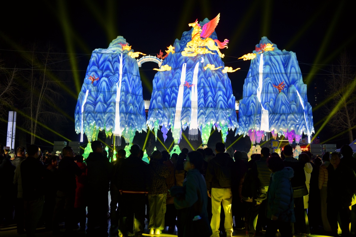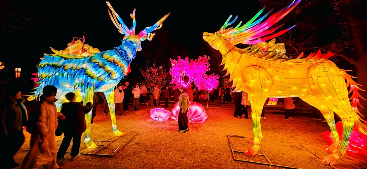 走进王城公园,明堂前的“骏驰山河”灯组气势恢宏,高达18米、长达25米的巨制成为全场的视觉焦点,引得游客纷纷驻足留影。移步动物园内,十二生肖机甲战士灯组则成了孩子们的“心头好”,酷炫的机甲风融合传统生肖文化,兼具童趣与科技感,许多小朋友兴奋地在自己的属相前合影留念。