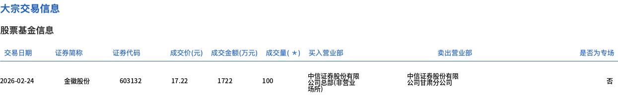 2月24日,金徽股份大宗交易成交100万股,成交额1722万元,占当日总成交额的5.33%,成交价17.22元,较市场收盘价17.48元折价1.49%。