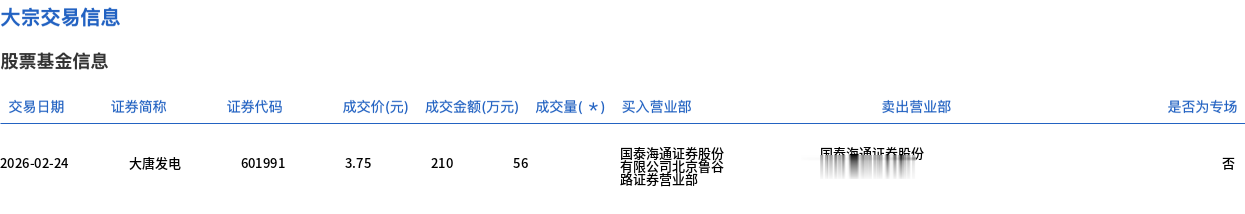大唐发电今日大宗交易平价成交56万股,成交额210万元