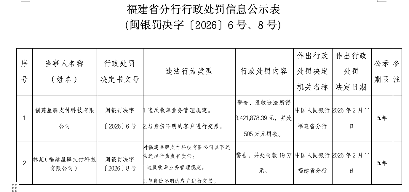 上证报中国证券网讯(记者徐潇潇)记者2月24日了解到,中国人民银行福建省分行近日作出处罚,福建星驿支付科技有限公司(下称“星驿支付”)因违反收单业务管理规定、与身份不明的客户进行交易,被警告、没收违法所得约342.19万元、并处505万元罚款;该公司相关责任人林某因对上述违法行为负有责任,被警告并处罚款19万元,此次处罚公示期限均为五年。